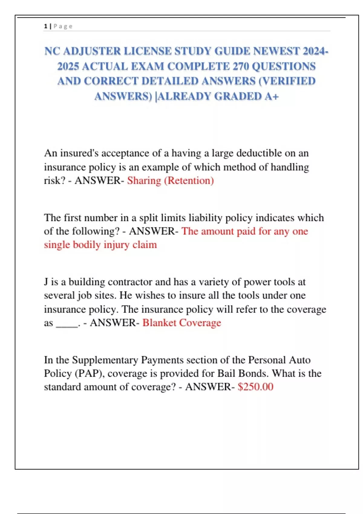 NC ADJUSTER LICENSE STUDY GUIDE NEWEST ACTUAL EXAM COMPLETE 270 QUESTIONS AND CORRECT DETAILED ANSWERS (VERIFIED ANSWERS) |ALREADY GRADED A+