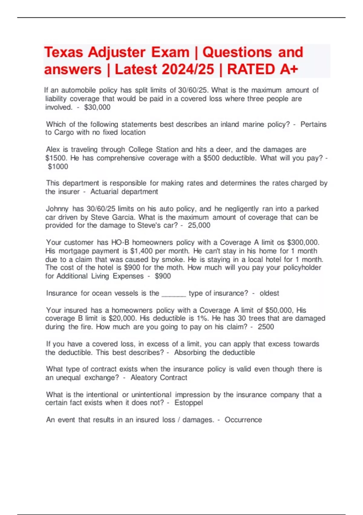Texas Adjuster Exam | Questions and answers | Latest 2024/25 | RATED A+