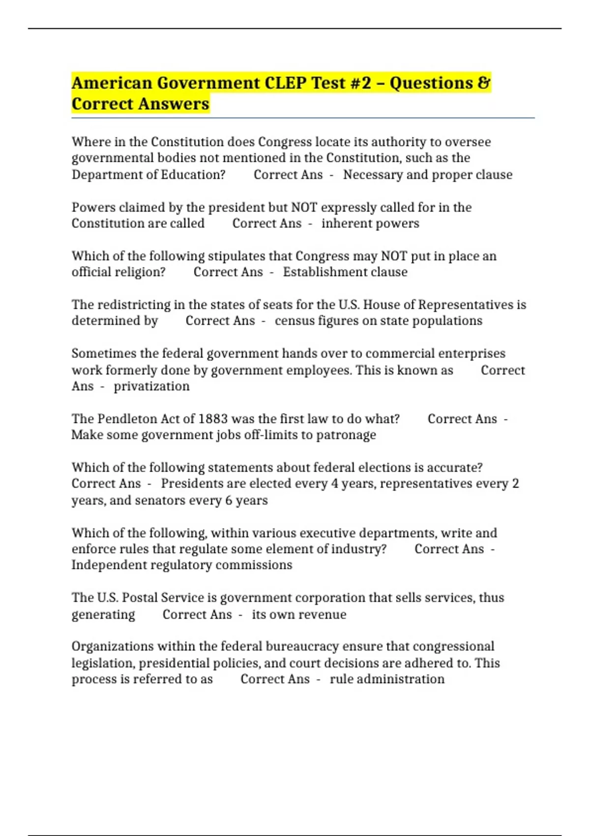 American Government CLEP Test #2 – Questions & Correct Answers