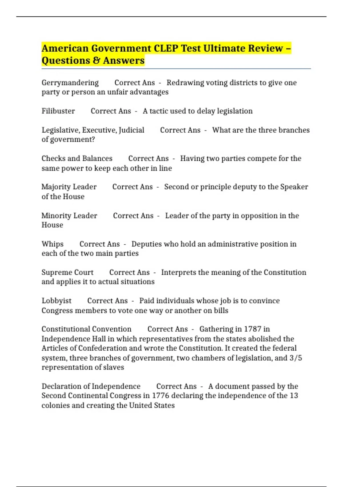 American Government CLEP Test Ultimate Review – Questions & Answers
