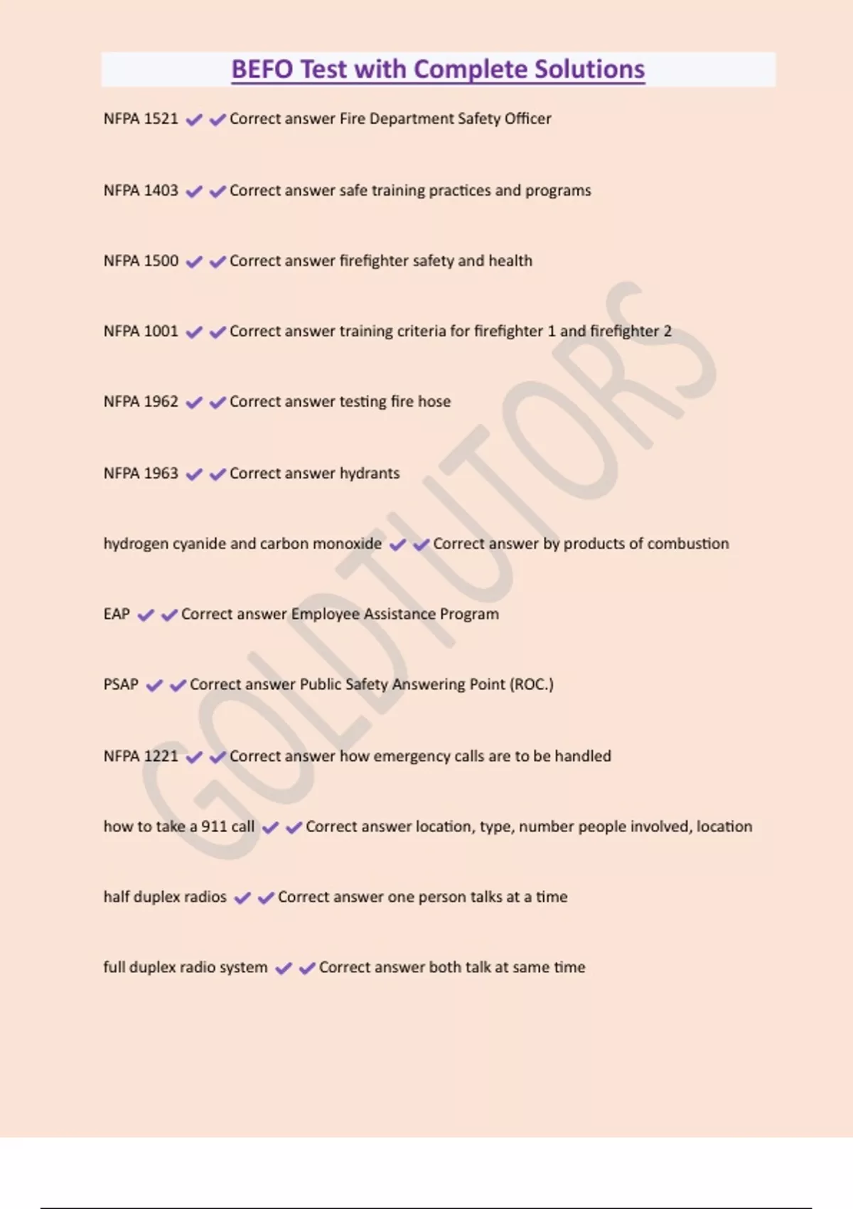 BEFO Test with Complete Solutions NFPA 1521 Correct answer Fire Department Safety Officer NFPA 1403 Correct answer safe training practices and programs NFPA 1500 Correct answer firefighter safety and health NFPA 1001 Correct answer training criteria for firefighter 1 and firefighter 2 NFPA 1962 Correct answer testing fire hose NFPA 1963 Correct answer hydrants