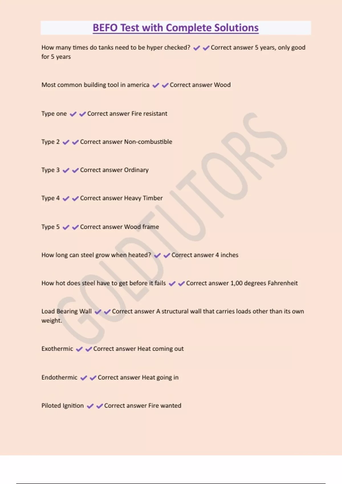 BEFO Test with Complete Solutions How many times do tanks need to be hyper checked? Correct answer 5 years, only good for 5 years Most common building tool in america Correct answer Wood Type one Correct answer Fire resistant Type 2 Correct answer Non-combustible Type 3 Correct answer Ordinary Type 4 Correct answer Heavy Timber Type 5 Correct answer Wood fram