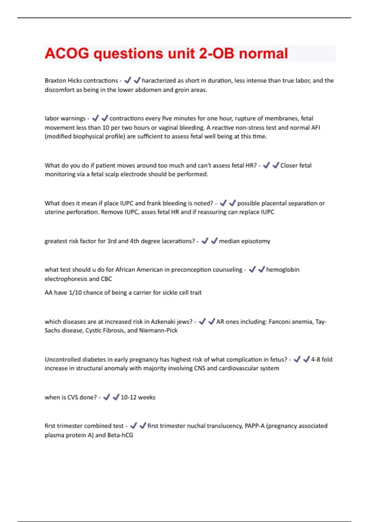 Braxton Hicks contractions - haracterized as short in duration, less intense than true labor, and the discomfort as being in the lower abdomen and groin areas. labor warnings - contractions every five minutes for one hour, rupture of membranes, fetal movement less than 10 per two hours or vaginal bleeding. A reactive non-stress test and normal AFI (modified biophysical profile) are sufficient to assess fetal well being at this time. What do you do if patient moves around too much and can't assess fetal HR? - Closer fetal monitoring via a fetal scalp electrode should be performed. What does it mean if place IUPC and frank bleeding is noted? - possible placental separation or uterine perforation. Remove IUPC, asses fetal HR and if reassuring can replace IUPC greatest risk factor for 3rd and 4th degree lacerations? - median episotomy what test should u do for African American in preconception counseling - hemoglobin electrophoresis and CBC AA have 1/10 chance of being a carrier for sickle cell trait which diseases are at increased risk in Azkenaki jews? - AR ones including: Fanconi anemia, TaySachs disease, Cystic Fibrosis, and Niemann-Pick Uncontrolled diabetes in early pregnancy has highest risk of what complication in fetus? - 4-8 fold increase in structural anomaly with majority involving CNS and cardiovascular system when is CVS done? - 10-12 weeks first trimester combined test - first trimester nuchal translucency, PAPP-A (pregnancy associated plasma protein A) and Beta-hCG- 85% Detection Rate of downs triple screen - second trimester AFP (alpha fetoprotein), Beta-hCG, uE3 (unconjugated estriol) - 69% Detection Rate quad screen - Quad screen: (second trimester Triple screen + inhibin A) - 81% Detection Rate sequential screen - Sequential screen: (first trimester NT and PAPP-A + second trimester quad screen) - 93% Detection Rate risk of miscarriage in CVS - 1% most common form of inherited mental retardation - fragile X syndrome how much weight should an obese woman gain in pregnancy? - 11-20 pounds features of newborn with Down syndrome - flattened nasal bridge, small size and small rotated, cup-shaped ears, sandal gap toes, hypotonia, a protruding tongue, short broad hands, Simian creases, epicanthic folds, and oblique palpebral fissures