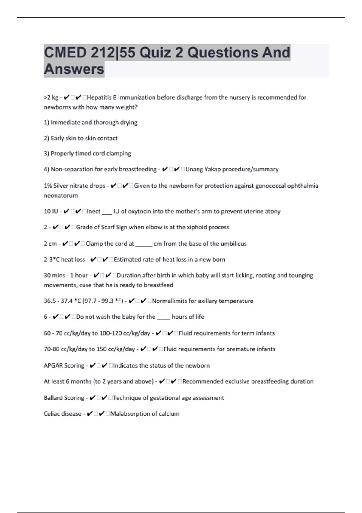 >2 kg - ️️Hepatitis B immunization before discharge from the nursery is recommended for newborns with how many weight? 1) Immediate and thorough drying 2) Early skin to skin contact 3) Properly timed cord clamping 4) Non-separation for early breastfeeding - ️️Unang Yakap procedure/summary 1% Silver nitrate drops - ️️Given to the newborn for protection against gonococcal ophthalmia neonatorum 10 IU - ️️Inect ___ IU of oxytocin into the mother's arm to prevent uterine atony 2 - ️️Grade of Scarf Sign when elbow is at the xiphoid process 2 cm - ️️Clamp the cord at _____ cm from the base of the umbilicus 2-3*C heat loss - ️️Estimated rate of heat loss in a new born 30 mins - 1 hour - ️️Duration after birth in which baby will start licking, rooting and tounging movements, cuse that he is ready to breastfeed 36.5 - 37.4 *C (97.7 - 99.3 *F) - ️️Normallimits for axillary temperature 6 - ️️Do not wash the baby for the ____ hours of life 60 - 70 cc/kg/day to 100-120 cc/kg/day - ️️Fluid requirements for term infants 70-80 cc/kg/day to 150 cc/kg/day - ️️Fluid requirements for premature infants APGAR Scoring - ️️Indicates the status of the newborn At least 6 months (to 2 years and above) - ️️Recommended exclusive breastfeeding duration Ballard Scoring - ️️Technique of gestational age assessment Celiac disease - ️️Malabsorption of calcium