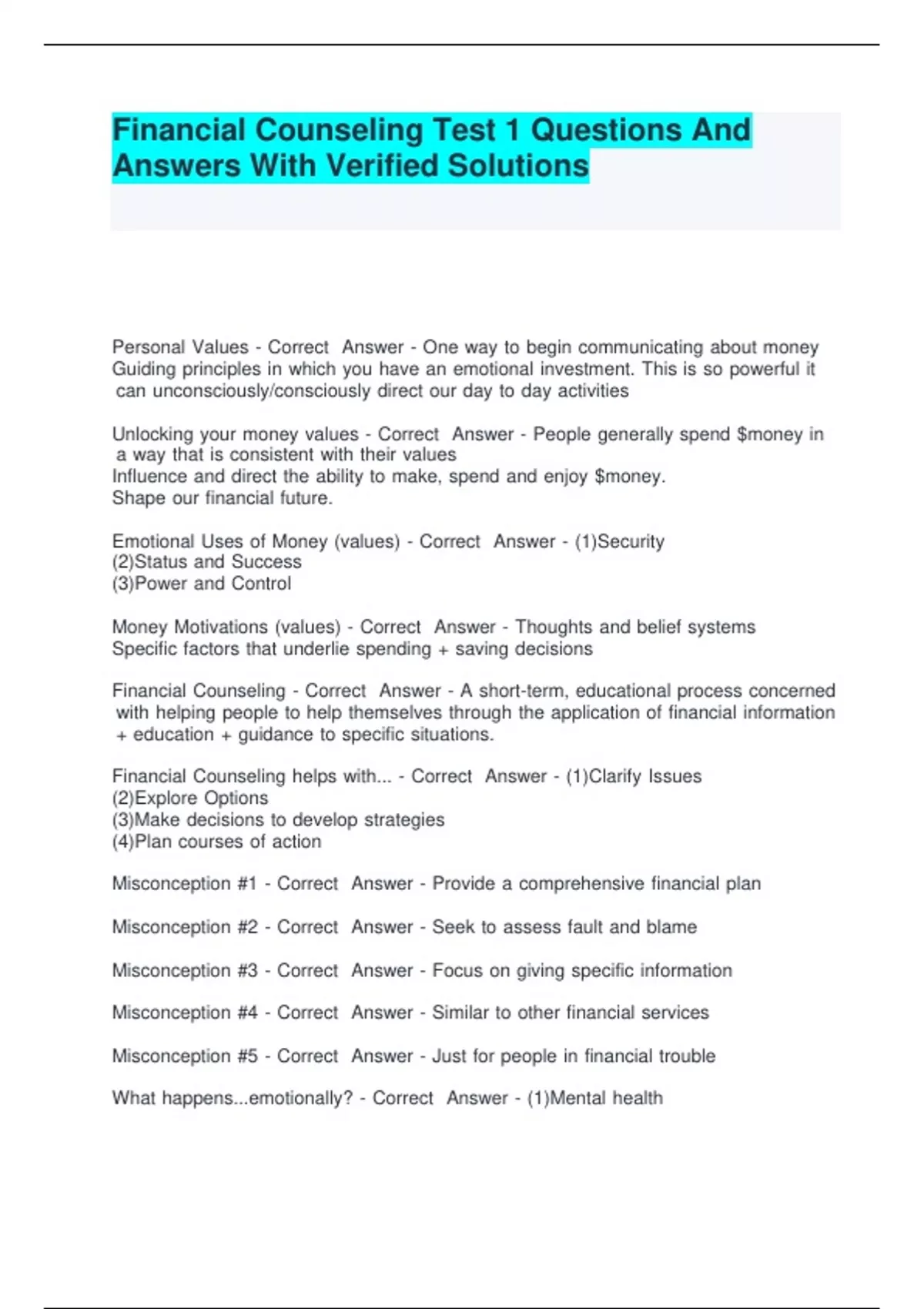 Financial Counseling Test 1 Questions And Answers With Verified Solutions.
