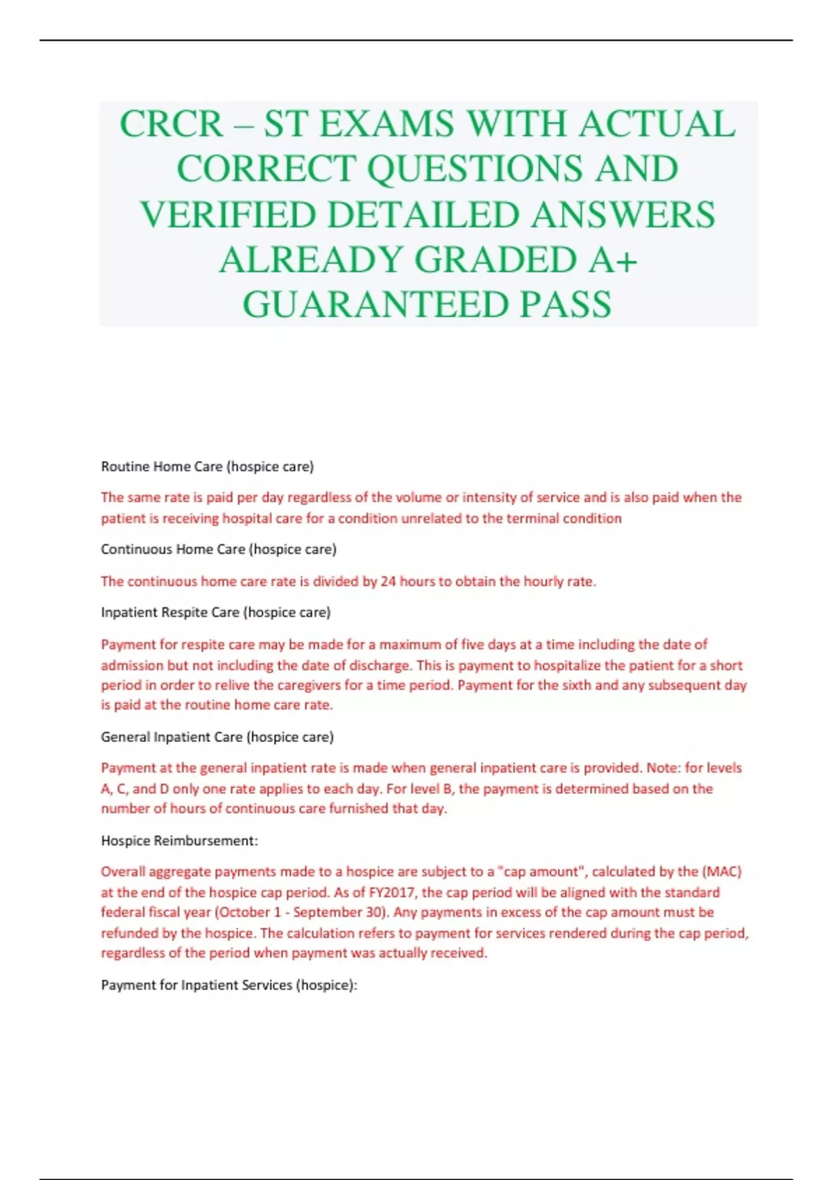 CRCR – ST EXAMS WITH ACTUAL CORRECT QUESTIONS AND VERIFIED DETAILED ANSWERS ALREADY GRADED A+ GUARANTEED PASS