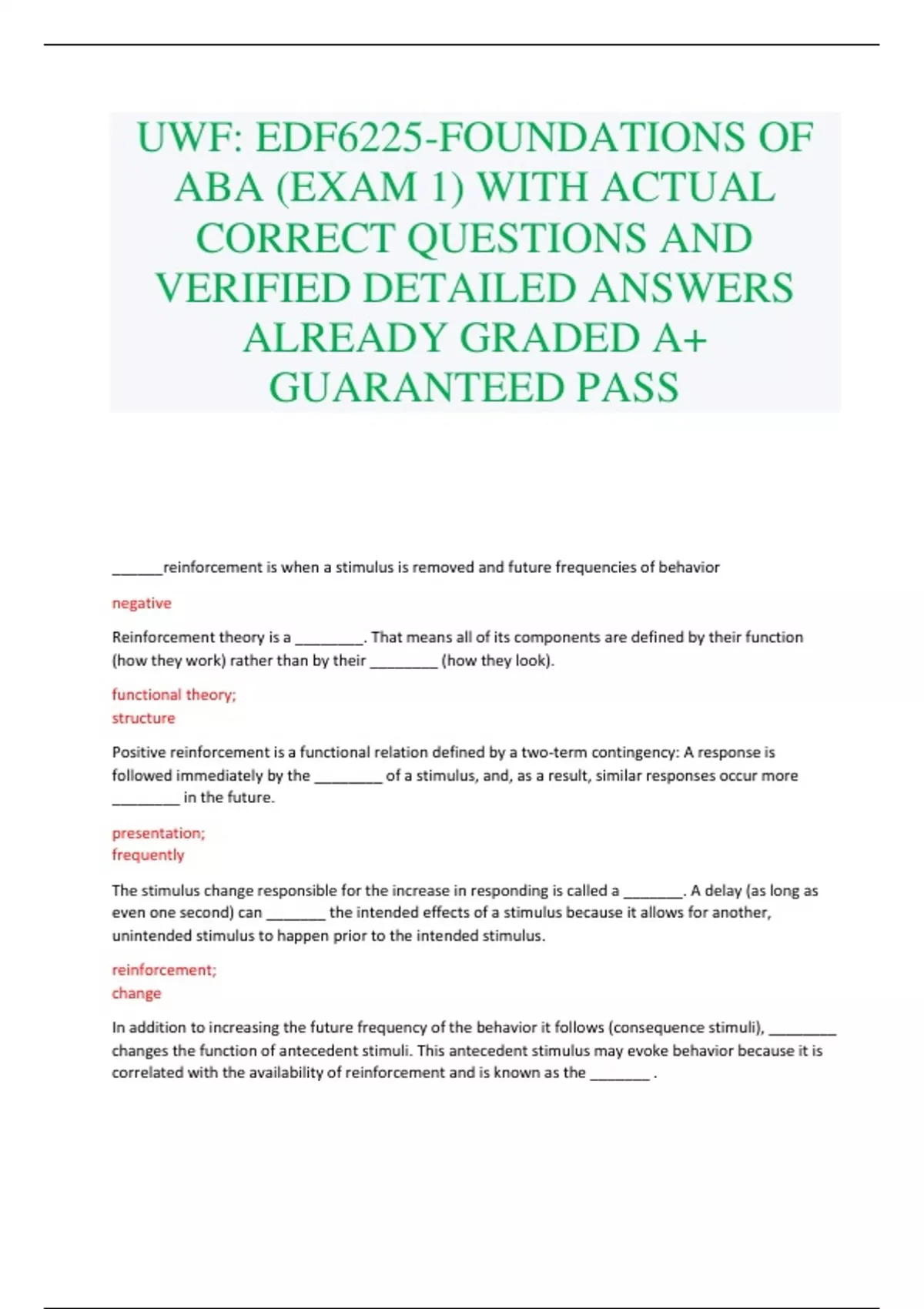 UWF: EDF6225-FOUNDATIONS OF ABA (EXAM 1) WITH ACTUAL CORRECT QUESTIONS AND VERIFIED DETAILED ANSWERS ALREADY GRADED A+ GUARANTEED PASS