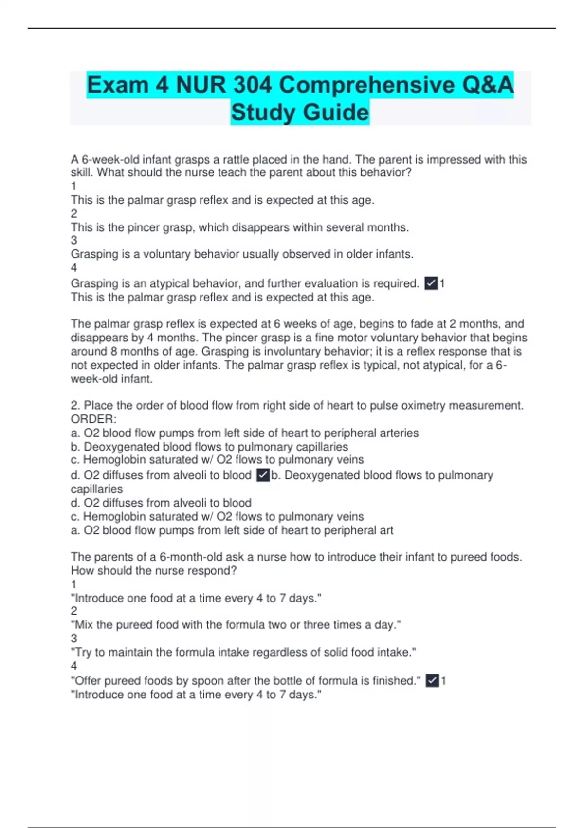 A 6-week-old infant grasps a rattle placed in the hand. The parent is impressed with this skill. What should the nurse teach the parent about this behavior? 1 This is the palmar grasp reflex and is expected at this age. 2 This is the pincer grasp, which disappears within several months. 3 Grasping is a voluntary behavior usually observed in older infants. 4 Grasping is an atypical behavior, and further evaluation is required. 1 This is the palmar grasp reflex and is expected at this age. The palmar grasp reflex is expected at 6 weeks of age, begins to fade at 2 months, and disappears by 4 months. The pincer grasp is a fine motor voluntary behavior that begins around 8 months of age. Grasping is involuntary behavior; it is a reflex response that is not expected in older infants. The palmar grasp reflex is typical, not atypical, for a 6-week-old infant. 2. Place the order of blood flow from right side of heart to pulse oximetry measurement. ORDER: a. O2 blood flow pumps from left side of heart to peripheral arteries b. Deoxygenated blood flows to pulmonary capillaries c. Hemoglobin saturated w/ O2 flows to pulmonary veins d. O2 diffuses from alveoli to blood b. Deoxygenated blood flows to pulmonary capillaries d. O2 diffuses from alveoli to blood c. Hemoglobin saturated w/ O2 flows to pulmonary veins a. O2 blood flow pumps from left side of heart to peripheral art The parents of a 6-month-old ask a nurse how to introduce their infant to pureed foods. How should the nurse respond? 1 "Introduce one food at a time every 4 to 7 days." 2 "Mix the pureed food with the formula two or three times a day." 3 "Try to maintain the formula intake regardless of solid food intake." 4 "Offer pureed foods by spoon after the bottle of formula is finished." 1 "Introduce one food at a time every 4 to 7 days."
