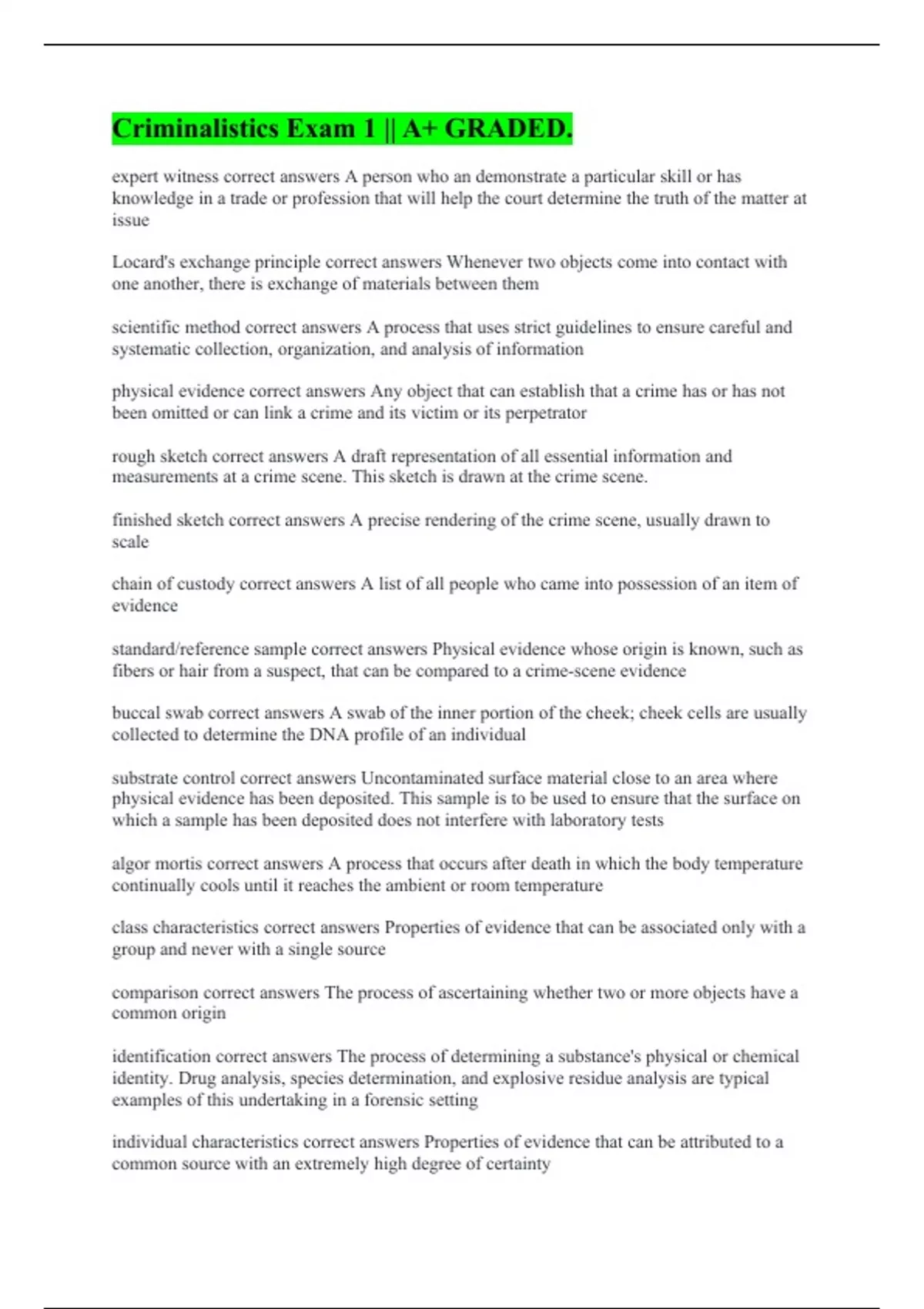 expert witness correct answers A person who an demonstrate a particular skill or has knowledge in a trade or profession that will help the court determine the truth of the matter at issue Locard's exchange principle correct answers Whenever two objects come into contact with one another, there is exchange of materials between them scientific method correct answers A process that uses strict guidelines to ensure careful and systematic collection, organization, and analysis of information physical evidence correct answers Any object that can establish that a crime has or has not been omitted or can link a crime and its victim or its perpetrator rough sketch correct answers A draft representation of all essential information and measurements at a crime scene. This sketch is drawn at the crime scene. finished sketch correct answers A precise rendering of the crime scene, usually drawn to scale chain of custody correct answers A list of all people who came into possession of an item of evidence standard/reference sample correct answers Physical evidence whose origin is known, such as fibers or hair from a suspect, that can be compared to a crime-scene evidence buccal swab correct answers A swab of the inner portion of the cheek; cheek cells are usually collected to determine the DNA profile of an individual substrate control correct answers Uncontaminated surface material close to an area where physical evidence has been deposited. This sample is to be used to ensure that the surface on which a sample has been deposited does not interfere with laboratory tests algor mortis correct answers A process that occurs after death in which the body temperature continually cools until it reaches the ambient or room temperature class characteristics correct answers Properties of evidence that can be associated only with a group and never with a single source comparison correct answers The process of ascertaining whether two or more objects have a common origin identification correct answers The process of determining a substance's physical or chemical identity. Drug analysis, species determination, and explosive residue analysis are typical examples of this undertaking in a forensic setting individual characteristics correct answers Properties of evidence that can be attributed to a common source with an extremely high degree of certainty