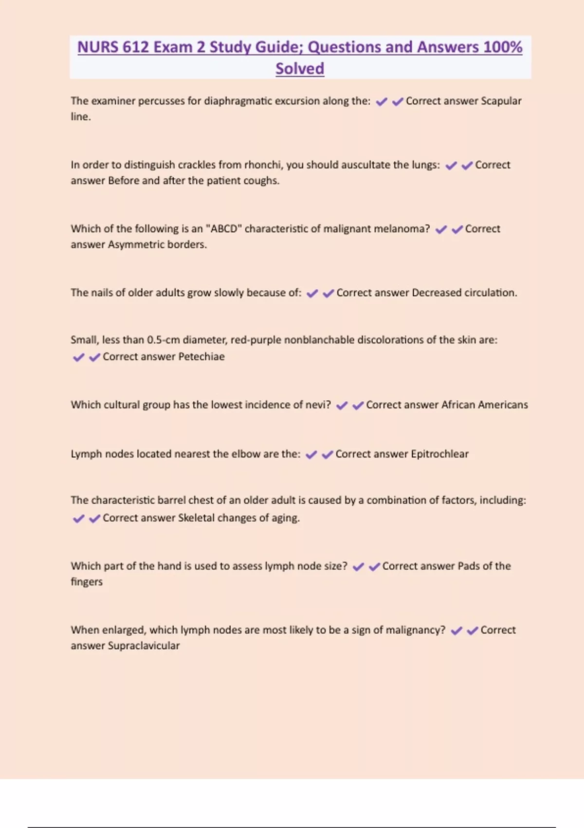 NURS 612 Exam 2 Study Guide; Questions and Answers 100% Solved The examiner percusses for diaphragmatic excursion along the: Correct answer Scapular line. In order to distinguish crackles from rhonchi, you should auscultate the lungs: Correct answer Before and after the patient coughs. Which of the following is an "ABCD" characteristic of malignant melanoma? Correct answer Asymmetric borders. The nails of older adults grow slowly because of: Correct answer Decreased circulation. Small, less than 0.5-cm diamete