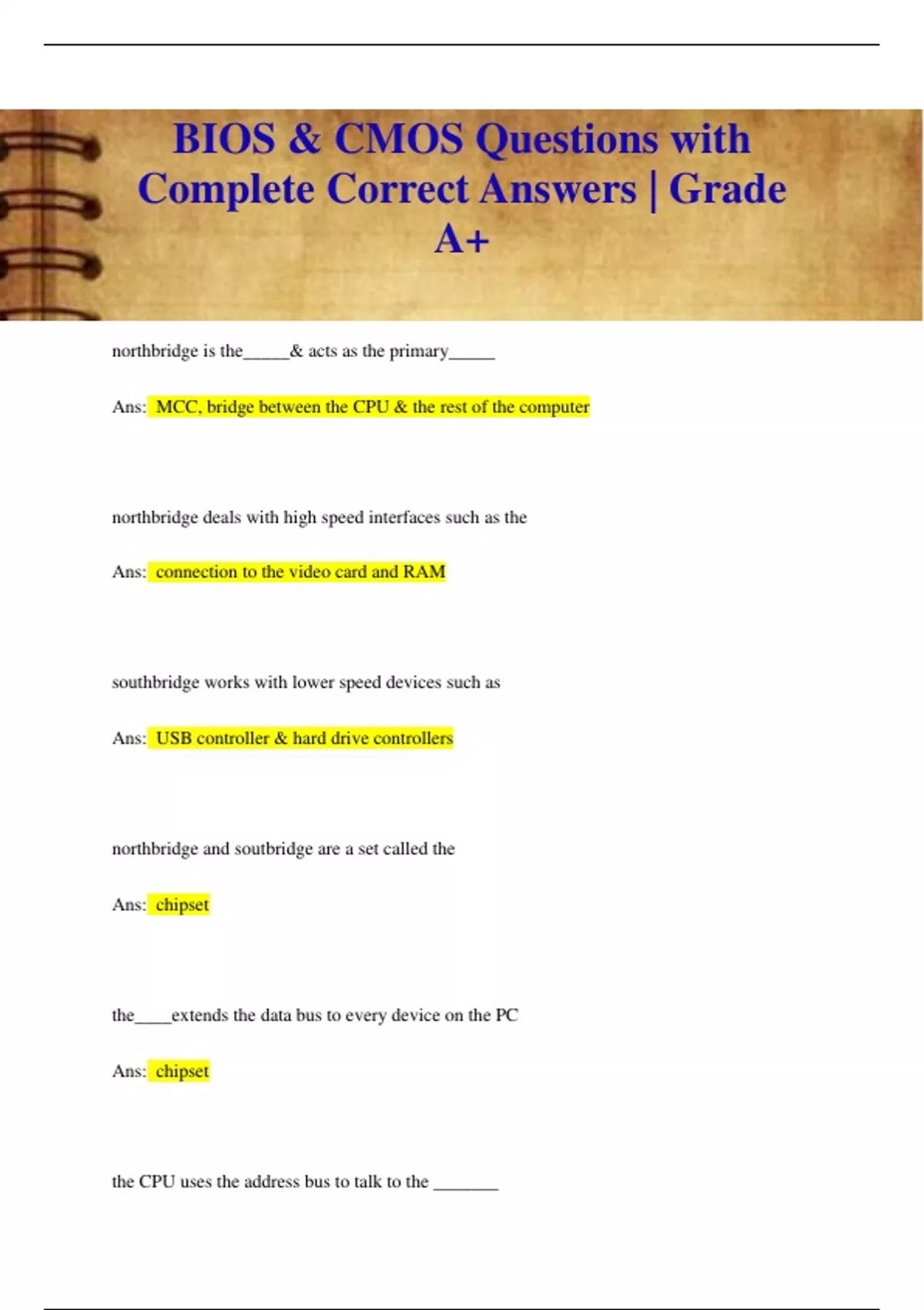 northbridge is the_____& acts as the primary_____ Ans: MCC, bridge between the CPU & the rest of the computer northbridge deals with high speed interfaces such as the Ans: connection to the video card and RAM southbridge works with lower speed devices such as Ans: USB controller & hard drive controllers northbridge and soutbridge are a set called the Ans: chipset the____extends the data bus to every device on the PC Ans: chipset the CPU uses the address bus to talk to the _______ Ans: devices in the early days the keyboard connected to the external data bus via Ans: a chip called the keyboard controller the______was one of the last________to be absorbed into the chipset Ans: keyboard controller, single-function chips when you use a keyboard a______is sent to the keyboard controller and stored in______ Ans: scan code, its own register BIOS stands for Ans: basic input/output services the programs that allow the CPU to communicate with devices is called Ans: services or device drivers what devices need BIOS Ans: all of them motherboards store device support programming on a Ans: ROM chip (read only memory) ROM stores programs like______in a ______wide spreadsheet Ans: RAM, 8-bit wide first ROM chips were