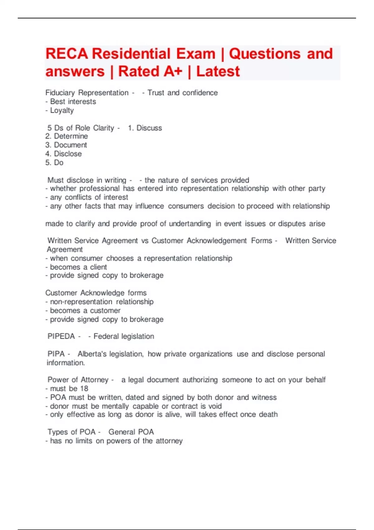 RECA Residential Exam | Questions and answers | Rated A+ | Latest