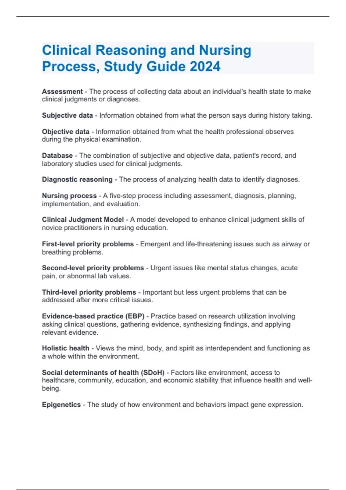 Clinical Reasoning and Nursing Process, Study Guide 2024 Assessment - The process of collecting data about an individual's health state to make clinical judgments or diagnoses. Subjective data - Information obtained from what the person says during history taking. Objective data - Information obtained from what the health professional observes during the physical examination. Database - The combination of subjective and objective data, patient's record, and laboratory studies used for clinical judgments. Diagnostic reasoning - The process of analyzing health data to identify diagnoses. Nursing process - A five-step process including assessment, diagnosis, planning, implementation, and evaluation. Clinical Judgment Model - A model developed to enhance clinical judgment skills of novice practitioners in nursing education. First-level priority problems - Emergent and life-threatening issues such as airway or breathing problems. Second-level priority problems - Urgent issues like mental status changes, acute pain, or abnormal lab values. Third-level priority problems - Important but less urgent problems that can be addressed after more critical issues. Evidence-based practice (EBP) - Practice based on research utilization involving asking clinical questions, gathering evidence, synthesizing findings, and applying relevant evidence. Holistic health - Views the mind, body, and spirit as interdependent and functioning as a whole within the environment. Social determinants of health (SDoH) - Factors like environment, access to healthcare, community, education, and economic stability that influence health and well-being. Epigenetics - The study of how environment and behaviors impact gene expression. Life cycle factors - Considerations such as developmental tasks and age-related changes during health assessments. Cross-cultural factors - Aspects that may influence health beliefs, practices, and outcomes from different cultural backgrounds. Factors Affecting Communication - Various sender-related, receiver-related, environmental, and message-related factors that influence communication. Ten Traps of Interviewing - Common pitfalls in interviewing including leading questions, interrupting, and focusing on negatives. Being too formal or informal - The tone should be appropriate for the situation. Not listening actively - Failing to pay attention and understand the interviewee's perspective. Being unprepared - Lack of planning can lead to missed opportunities and wasted time.