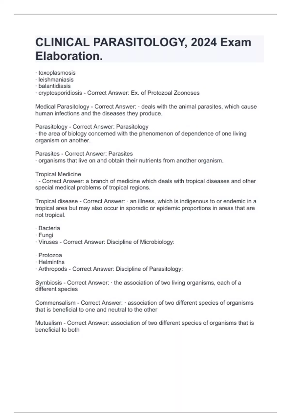CLINICAL PARASITOLOGY, 2024 Exam Elaboration. Medical Parasitology - Correct Answer: · deals with the animal parasites, which cause human infections and the diseases they produce. Parasitology - Correct Answer: Parasitology · the area of biology concerned with the phenomenon of dependence of one living organism on another. Parasites - Correct Answer: Parasites · organisms that live on and obtain their nutrients from another organism. Tropical Medicine · - Correct Answer: a branch of medicine which deals with tropical diseases and other special medical problems of tropical regions. Tropical disease - Correct Answer: · an illness, which is indigenous to or endemic in a tropical area but may also occur in sporadic or epidemic proportions in areas that are not tropical. · Bacteria · Fungi · Viruses - Correct Answer: Discipline of Microbiology: · Protozoa · Helminths · Arthropods - Correct Answer: Discipline of Parasitology: Symbiosis - Correct Answer: · the association of two living organisms, each of a different species Commensalism - Correct Answer: · association of two different species of organisms that is beneficial to one and neutral to the other Mutualism - Correct Answer: association of two different species of organisms that is beneficial to both Parasitism - Correct Answer: · association of two different species of organisms that is beneficial to one at the other's expense