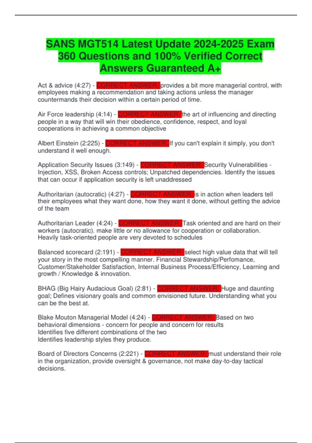 SANS MGT514 Latest Update Exam 360 Questions and 100% Verified Correct Answers Guaranteed A+