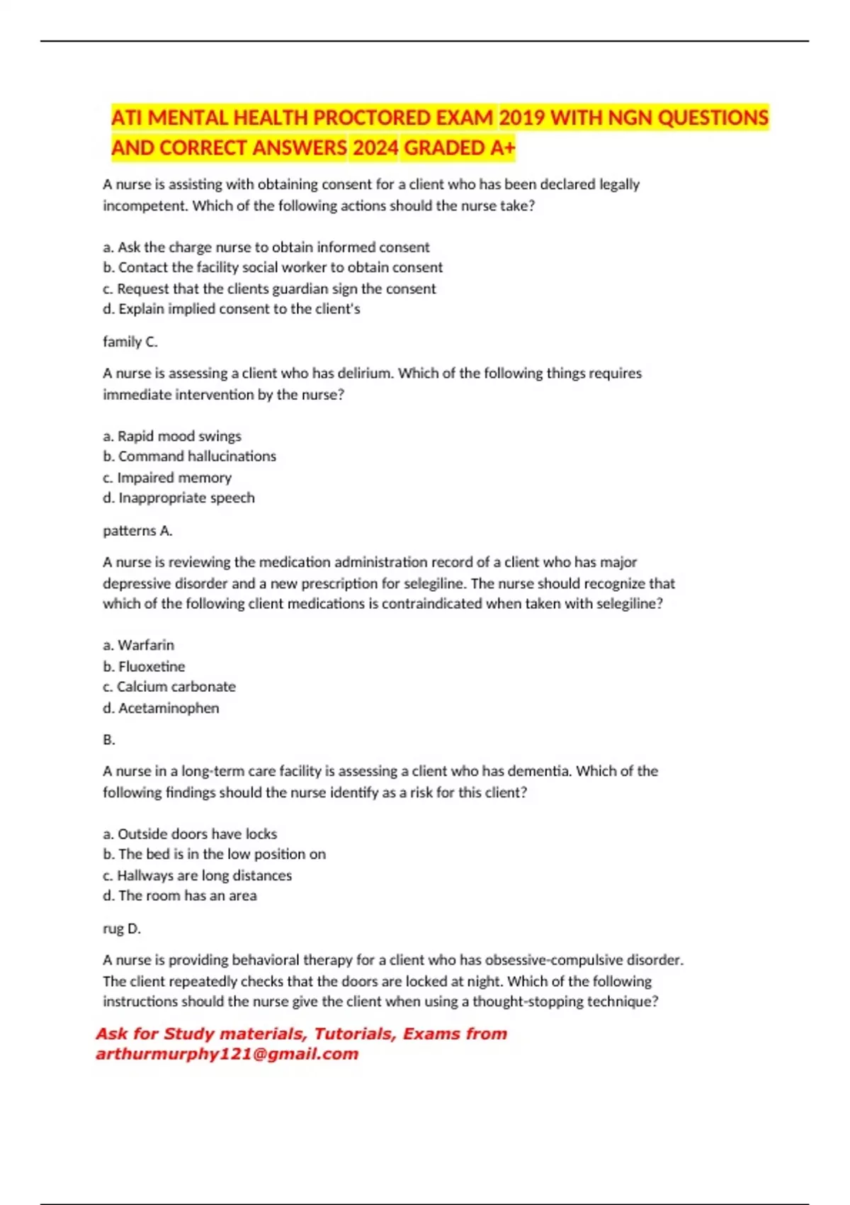 ATI MENTAL HEALTH PROCTORED EXAM 2019 WITH NGN QUESTIONS AND CORRECT ANSWERS 2024 GRADED A+
