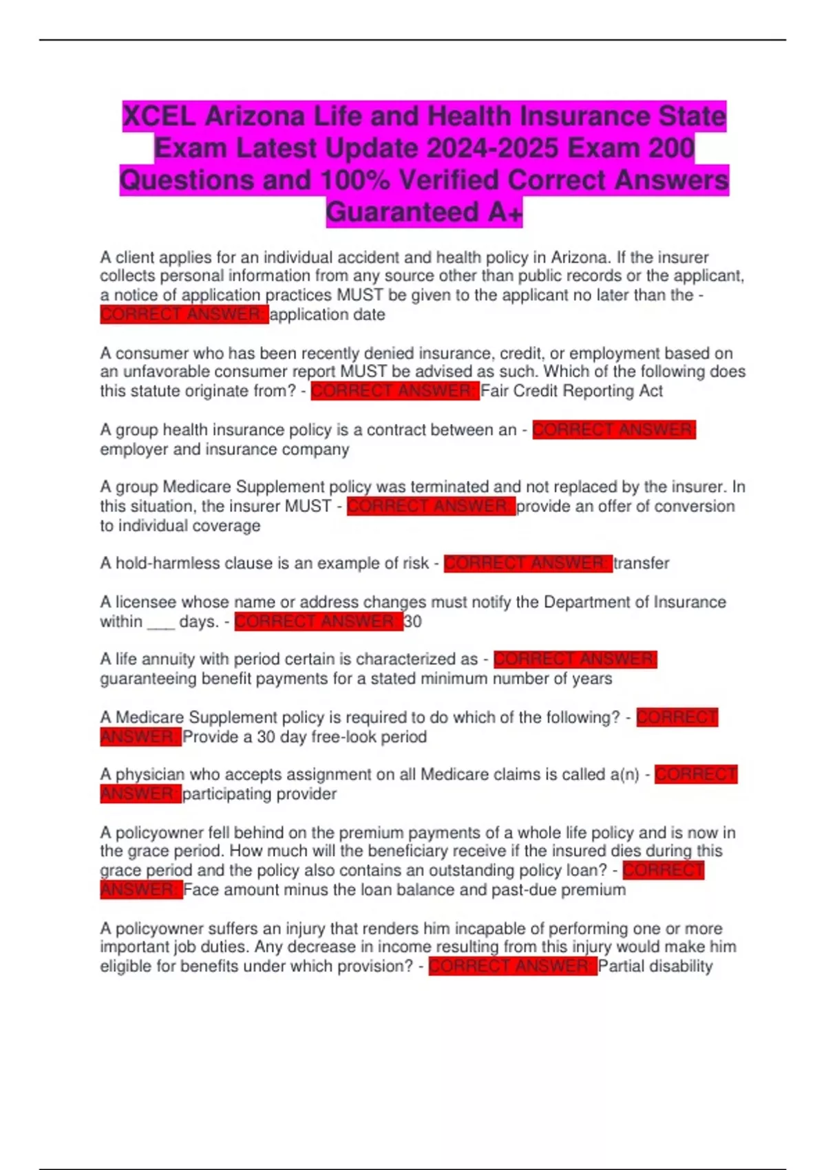 XCEL Arizona Life and Health Insurance State Exam Latest Update Exam 200 Questions and 100% Verified Correct Answers Guaranteed A+