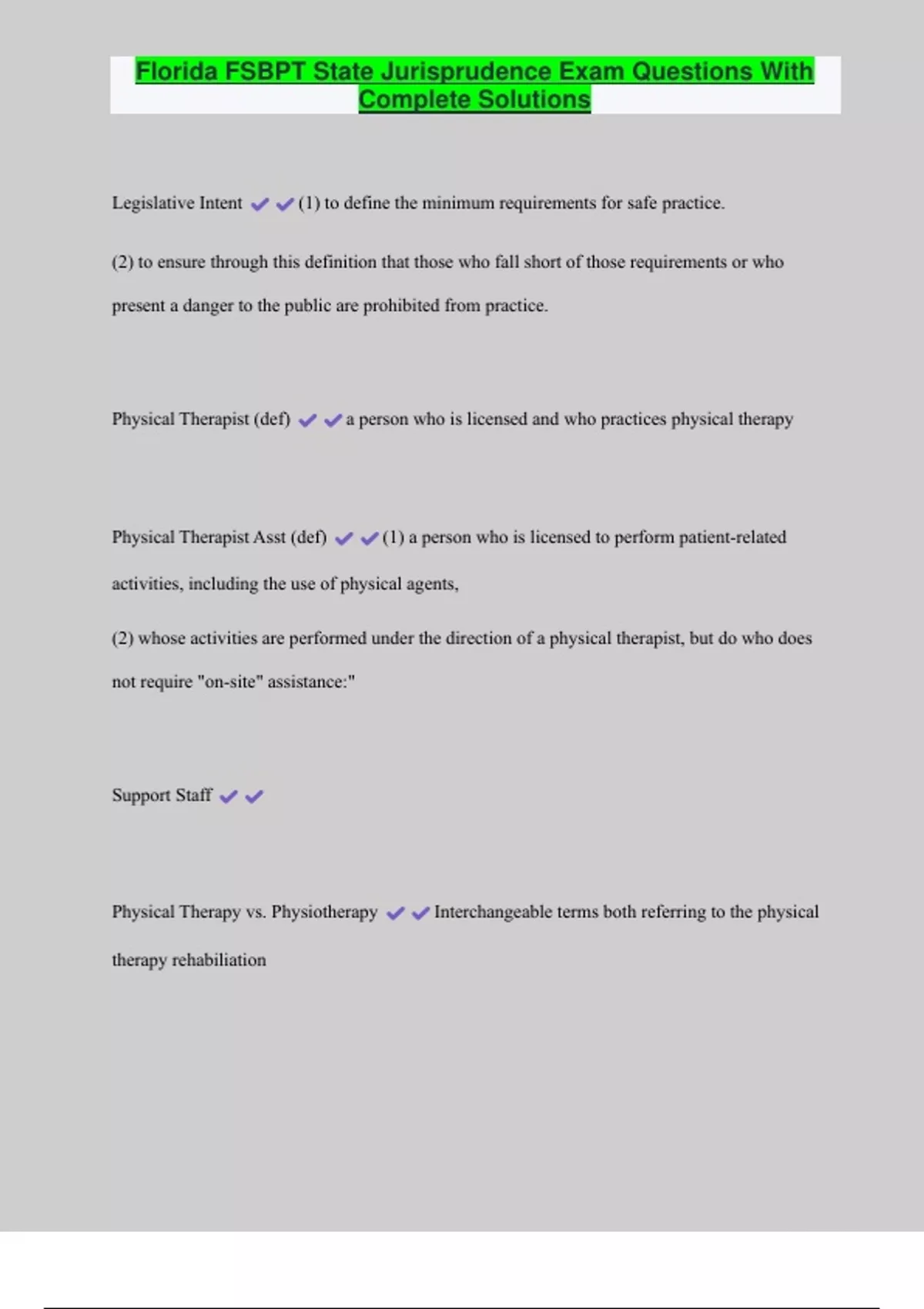 Florida FSBPT State Jurisprudence Exam Questions With Complete Solutions Legislative Intent (1) to define the minimum requirements for safe practice. (2) to ensure through this definition that those who fall short of those requirements or who present a danger to the public are prohibited from practice. Physical Therapist (def) a person who is licensed and who practices physical therapy Physical Therapist Asst (def) (1) a person who is licensed to perform patient-related activities, including the use of physical agents, (2) whose activities are performed under the direction of a physical therapist, but do who does not require "on-site" assistance:"