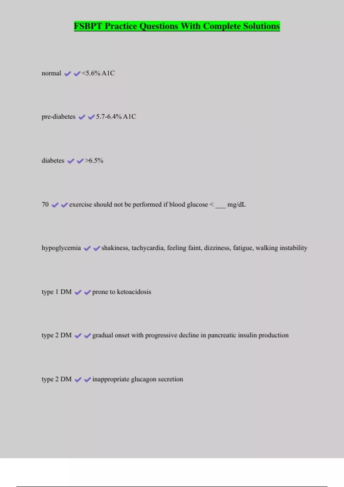 FSBPT Practice Questions With Complete Solutions normal <5.6% A1C pre-diabetes 5.7-6.4% A1C diabetes >6.5% 70 exercise should not be performed if blood glucose < ___ mg/dL hypoglycemia shakiness, tachycardia, feeling faint, dizziness, fatigue, walking instability type 1 DM prone to ketoacidosis