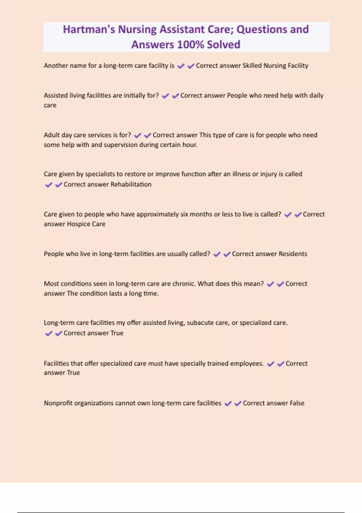 Hartman's Nursing Assistant Care; Questions and Answers 100% Solved Another name for a long-term care facility is Correct answer Skilled Nursing Facility Assisted living facilities are initially for? Correct answer People who need help with daily care Adult day care services is for? Correct answer This type of care is for people who need some help with and supervision during certain hour. Care given by specialists to restore or improve function after an illness or injury is called Correct answer Rehabilitation