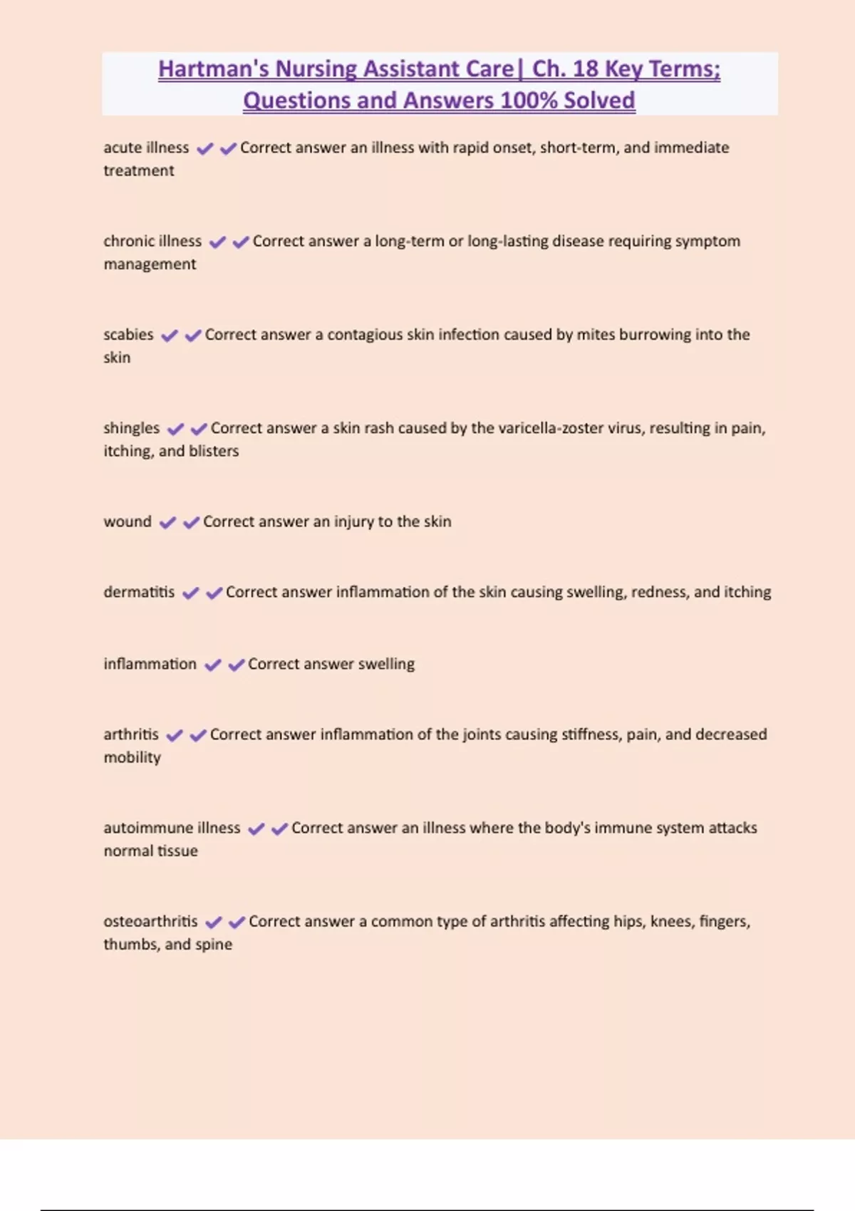 Hartman's Nursing Assistant Care| Ch. 18 Key Terms; Questions and Answers 100% Solved acute illness Correct answer an illness with rapid onset, short-term, and immediate treatment chronic illness Correct answer a long-term or long-lasting disease requiring symptom management scabies Correct answer a contagious skin infection caused by mites burrowing into the skin shingles Correct answer a skin rash caused by the varicella-zoster virus, resulting in pain, itching, and blisters wound Correct answer an injury to the skin dermatitis Correct answer inflammation of the skin causing swelling, redness, and itching inflammation Correct answer swelling