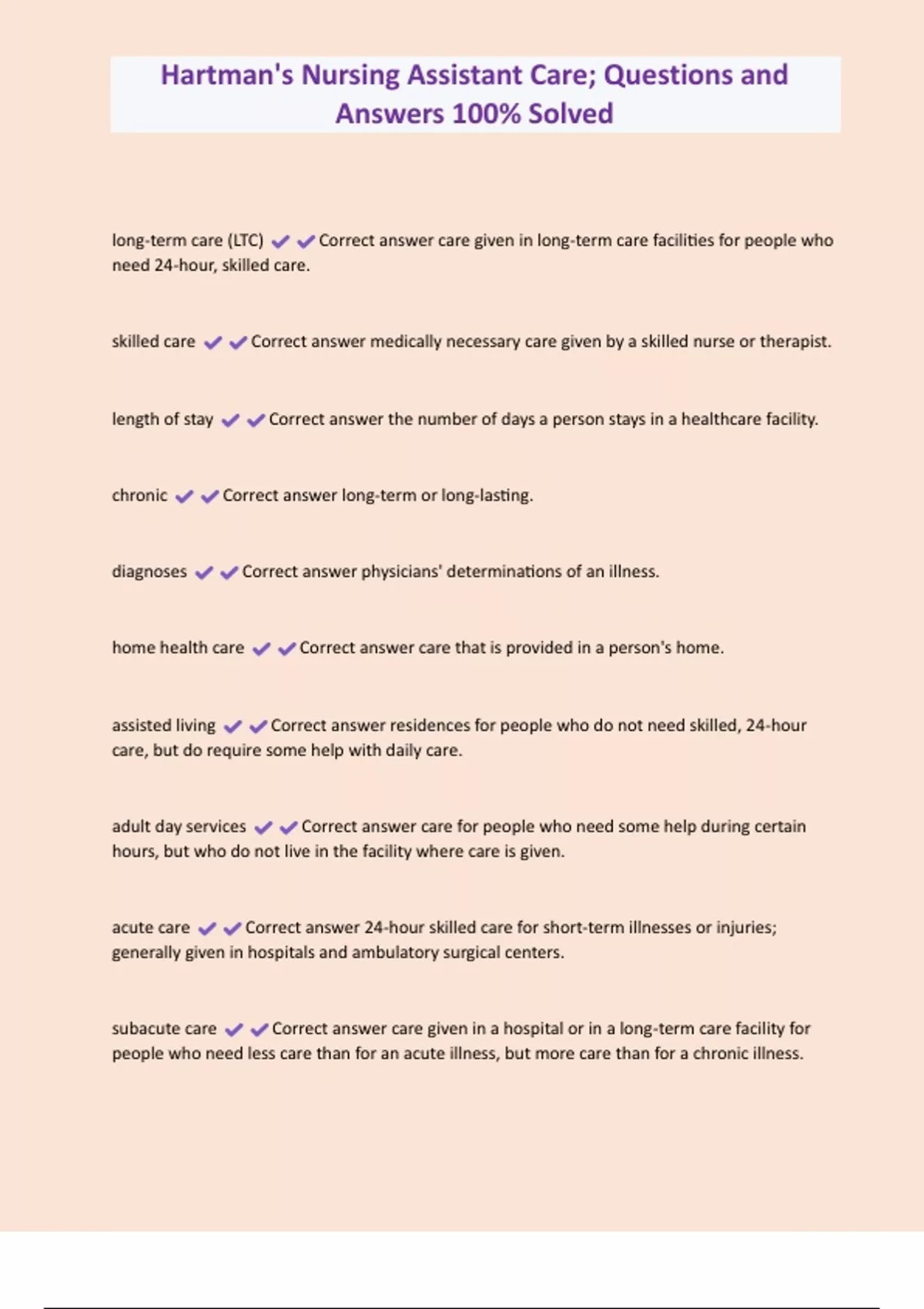 Hartman's Nursing Assistant Care; Questions and Answers 100% Solved long-term care (LTC) Correct answer care given in long-term care facilities for people who need 24-hour, skilled care. skilled care Correct answer medically necessary care given by a skilled nurse or therapist. length of stay Correct answer the number of days a person stays in a healthcare facility. chronic Correct answer long-term or long-lasting. diagnoses Correct answer physicians' determinations of an illness. home health care Correct answer care that is provided in a person's home