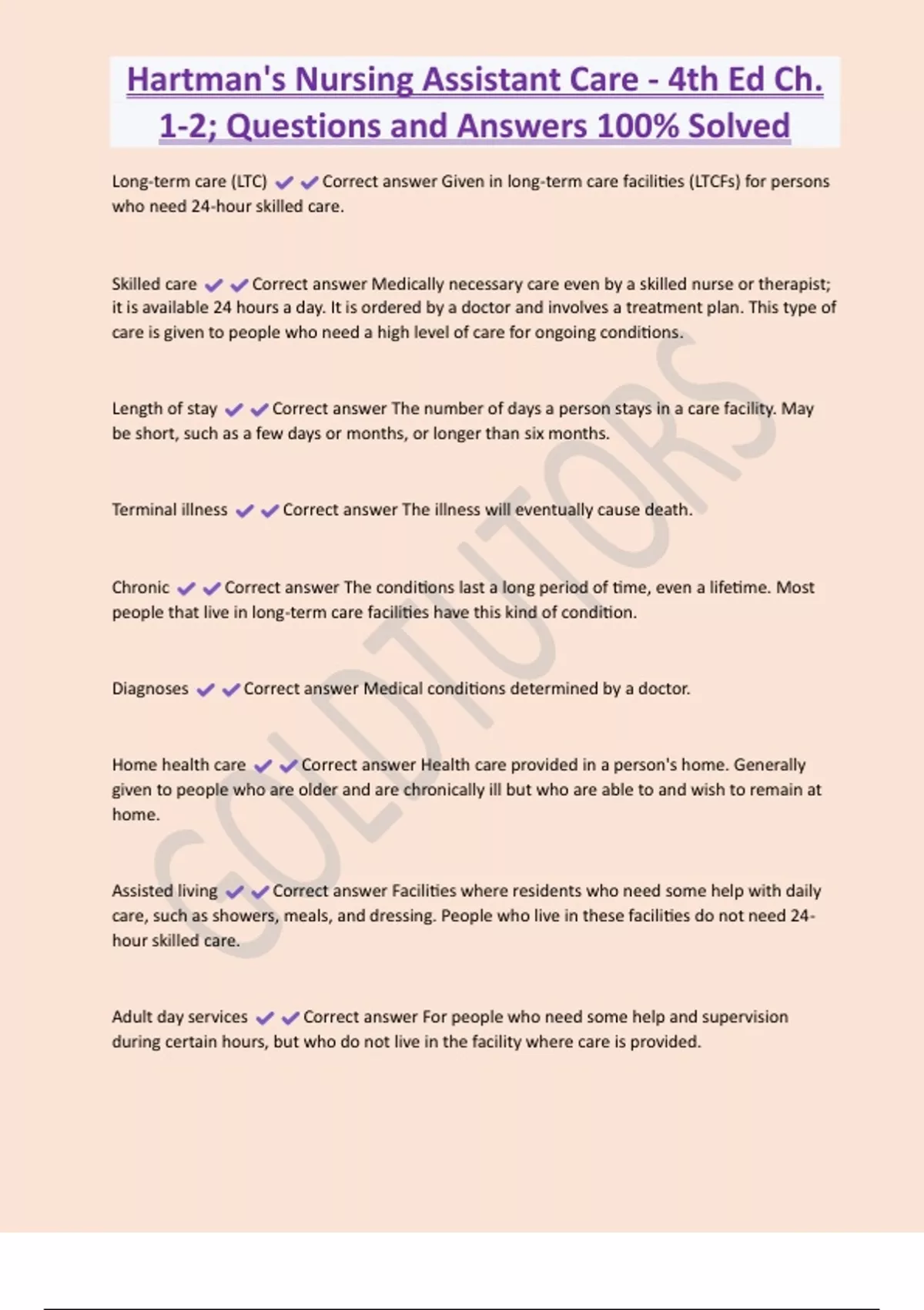 Hartman's Nursing Assistant Care - 4th Ed Ch. 1-2; Questions and Answers 100% Solved Long-term care (LTC) Correct answer Given in long-term care facilities (LTCFs) for persons who need 24-hour skilled care. Skilled care Correct answer Medically necessary care even by a skilled nurse or therapist; it is available 24 hours a day. It is ordered by a doctor and involves a treatment plan. This type of care is given to people who need a high level of care for ongoing conditions. Length of stay Correct answer The number of days a person stays in a care facility. May be short, such as a few days or months, or longer than six months. Terminal illness Correct answer The illness will eventually cause death.