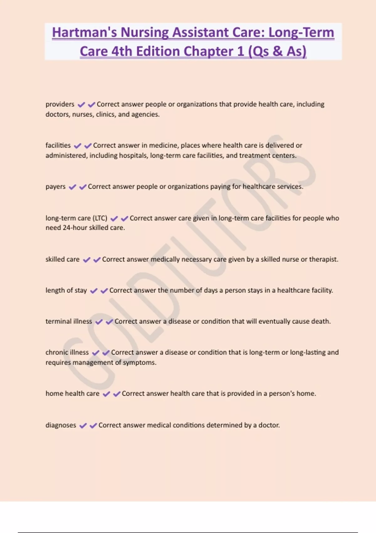 Hartman's Nursing Assistant Care: Long-Term Care 4th Edition Chapter 1 (Qs & As) providers Correct answer people or organizations that provide health care, including doctors, nurses, clinics, and agencies. facilities Correct answer in medicine, places where health care is delivered or administered, including hospitals, long-term care facilities, and treatment centers. payers Correct answer people or organizations paying for healthcare services. long-term care (LTC) Correct answer care given in long-term care facilities for people who need 24-hour skilled care.