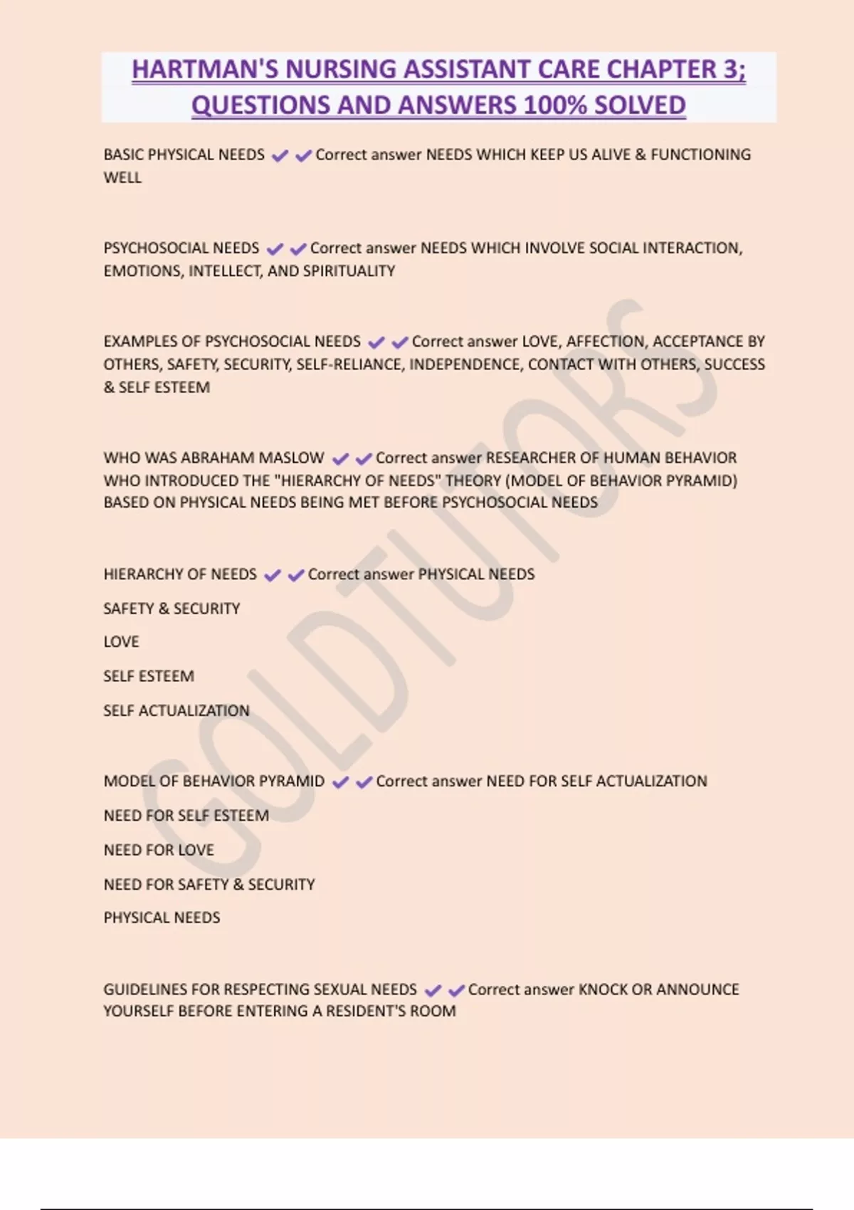 HARTMAN'S NURSING ASSISTANT CARE CHAPTER 3; QUESTIONS AND ANSWERS 100% SOLVED BASIC PHYSICAL NEEDS Correct answer NEEDS WHICH KEEP US ALIVE & FUNCTIONING WELL PSYCHOSOCIAL NEEDS Correct answer NEEDS WHICH INVOLVE SOCIAL INTERACTION, EMOTIONS, INTELLECT, AND SPIRITUALITY EXAMPLES OF PSYCHOSOCIAL NEEDS Correct answer LOVE, AFFECTION, ACCEPTANCE BY OTHERS, SAFETY, SECURITY, SELF-RELIANCE, INDEPENDENCE, CONTACT WITH OTHERS, SUCCESS & SELF ESTEEM WHO WAS ABRAHAM MASLOW Correct answer RESEARCHER OF HUMAN BEHAVIOR WHO INTRODUCED THE "HIERARCHY OF NEEDS" THEORY (MODEL OF BEHAVIOR PYRAMID) BASED ON PHYSICAL NEEDS BEING MET BEFORE PSYCHOS