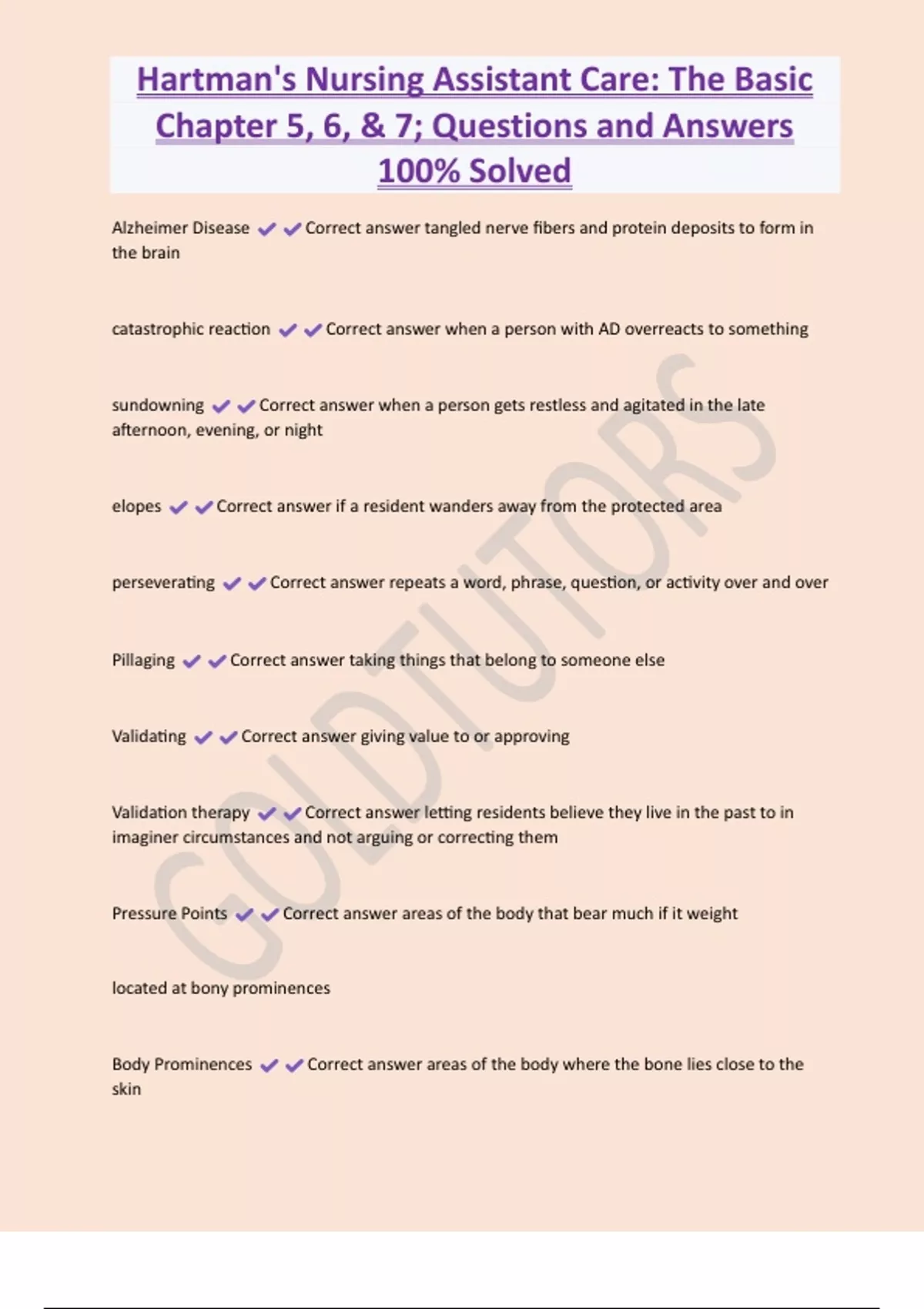Hartman's Nursing Assistant Care: The Basic Chapter 5, 6, & 7; Questions and Answers 100% Solved Alzheimer Disease Correct answer tangled nerve fibers and protein deposits to form in the brain catastrophic reaction Correct answer when a person with AD overreacts to something sundowning Correct answer when a person gets restless and agitated in the late afternoon, evening, or night elopes Correct answer if a resident wanders away from the protected area perseverating Correct answer repeats a word, phrase, question, or activity over and over Pillaging Correct answer taking things that belong to someone else Validating Correct answer giving value to or approving