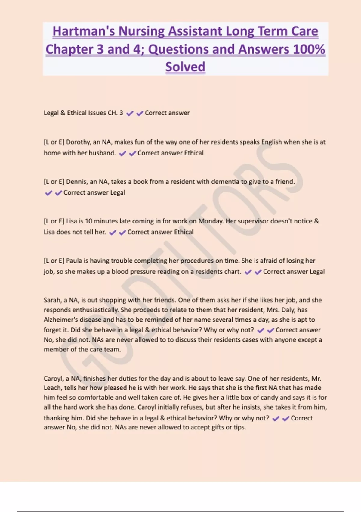 Hartman's Nursing Assistant Long Term Care Chapter 3 and 4; Questions and Answers 100% Solved Legal & Ethical Issues CH. 3 Correct answer [L or E] Dorothy, an NA, makes fun of the way one of her residents speaks English when she is at home with her husband. Correct answer Ethical [L or E] Dennis, an NA, takes a book from a resident with dementia to give to a friend. Correct answer Legal [L or E] Lisa is 10 minutes late coming in for work on Monday. Her supervisor doesn't notice & Lisa does not tell her. Correct answer Ethical