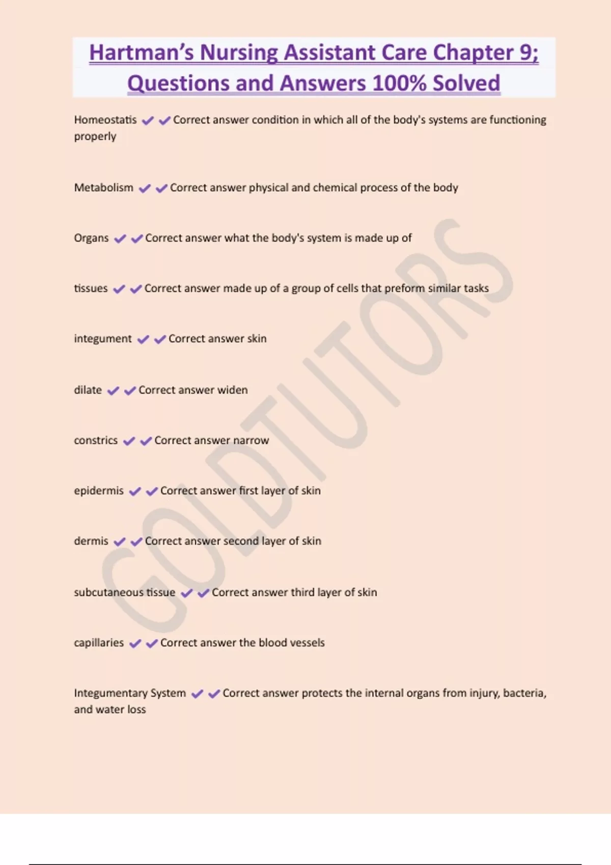 Hartman’s Nursing Assistant Care Chapter 9; Questions and Answers 100% Solved Homeostatis Correct answer condition in which all of the body's systems are functioning properly Metabolism Correct answer physical and chemical process of the body Organs Correct answer what the body's system is made up of tissues Correct answer made up of a group of cells that preform similar tasks integument Correct answer skin