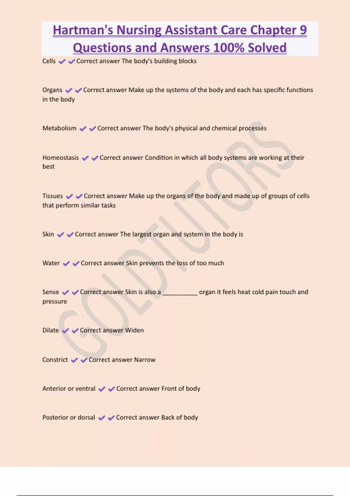 Hartman's Nursing Assistant Care Chapter 9 Questions and Answers 100% Solved Cells Correct answer The body's building blocks Organs Correct answer Make up the systems of the body and each has specific functions in the body Metabolism Correct answer The body's physical and chemical processes Homeostasis Correct answer Condition in which all body systems are working at their best Tissues Correct answer Make up the organs of the body and made up of groups of cells that perform similar tasks Skin Correct answer The largest organ and system in the body is Water Correct answer Skin prevents the loss of too much