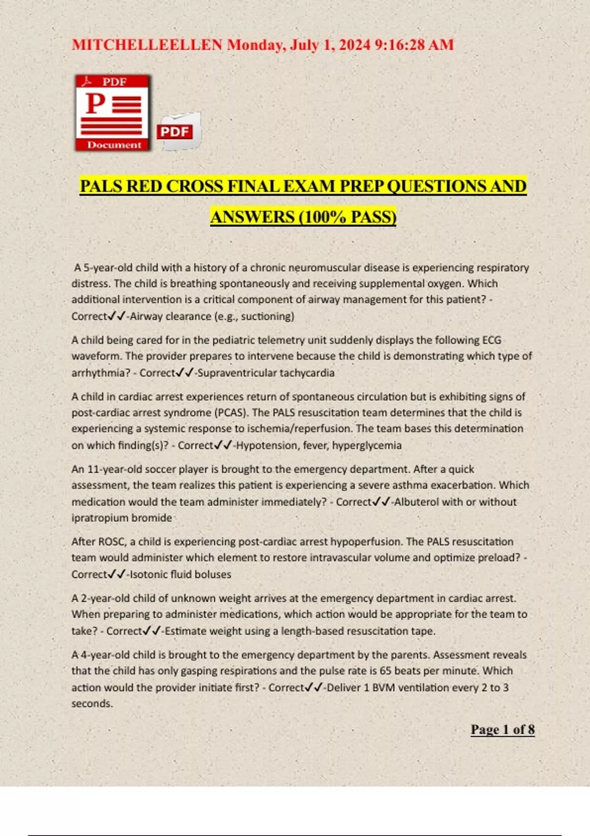 PALS RED CROSS FINAL EXAM PREP QUESTIONS AND ANSWERS (100% PASS)