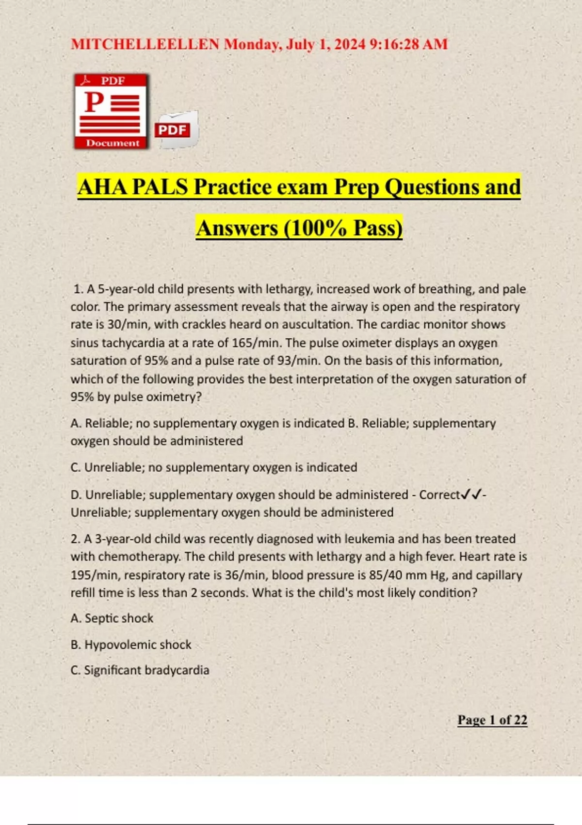 AHA PALS Practice exam Prep Questions and Answers (100% Pass)
