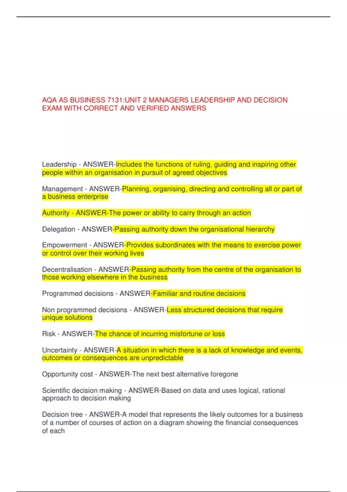 AQA AS BUSINESS 7131:UNIT 2 MANAGERS LEADERSHIP AND DECISION EXAM WITH CORRECT AND VERIFIED ANSWERS