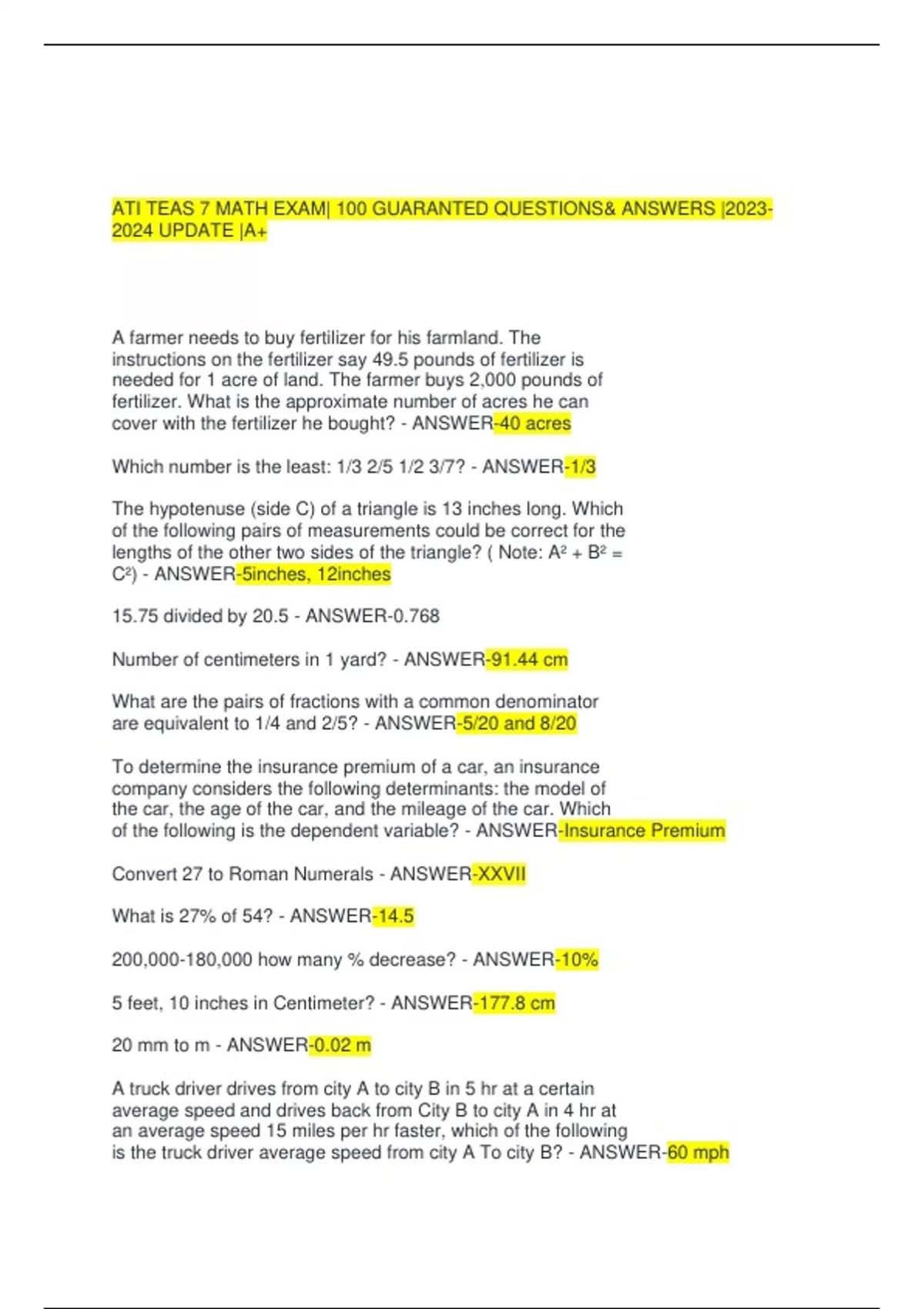 ATI TEAS 7 MATH EXAM| 100 GUARANTED QUESTIONS& ANSWERS |2023- 2024 UPDATE |A+