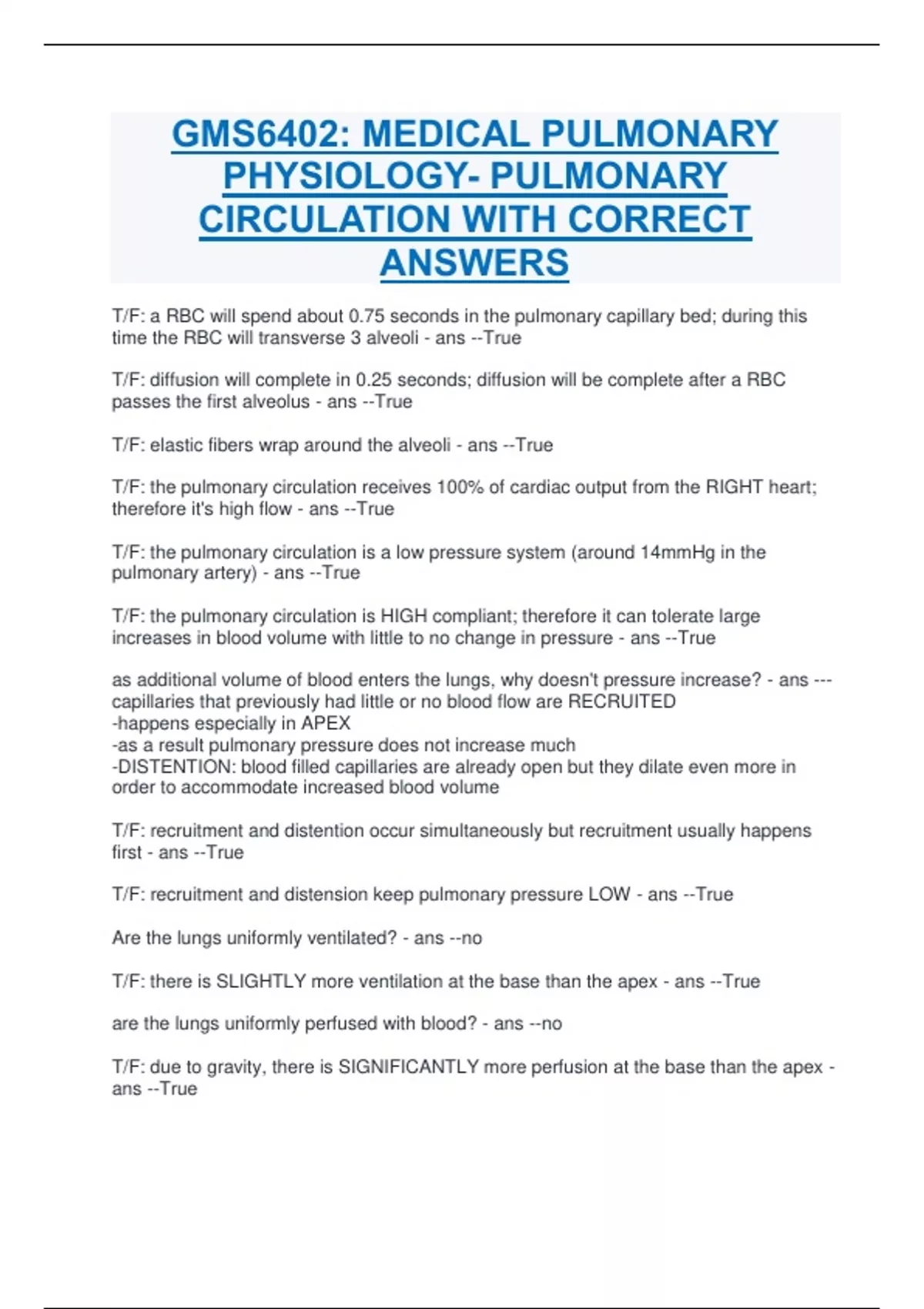 GMS6402: MEDICAL PULMONARY PHYSIOLOGY- PULMONARY CIRCULATION WITH CORRECT ANSWERS