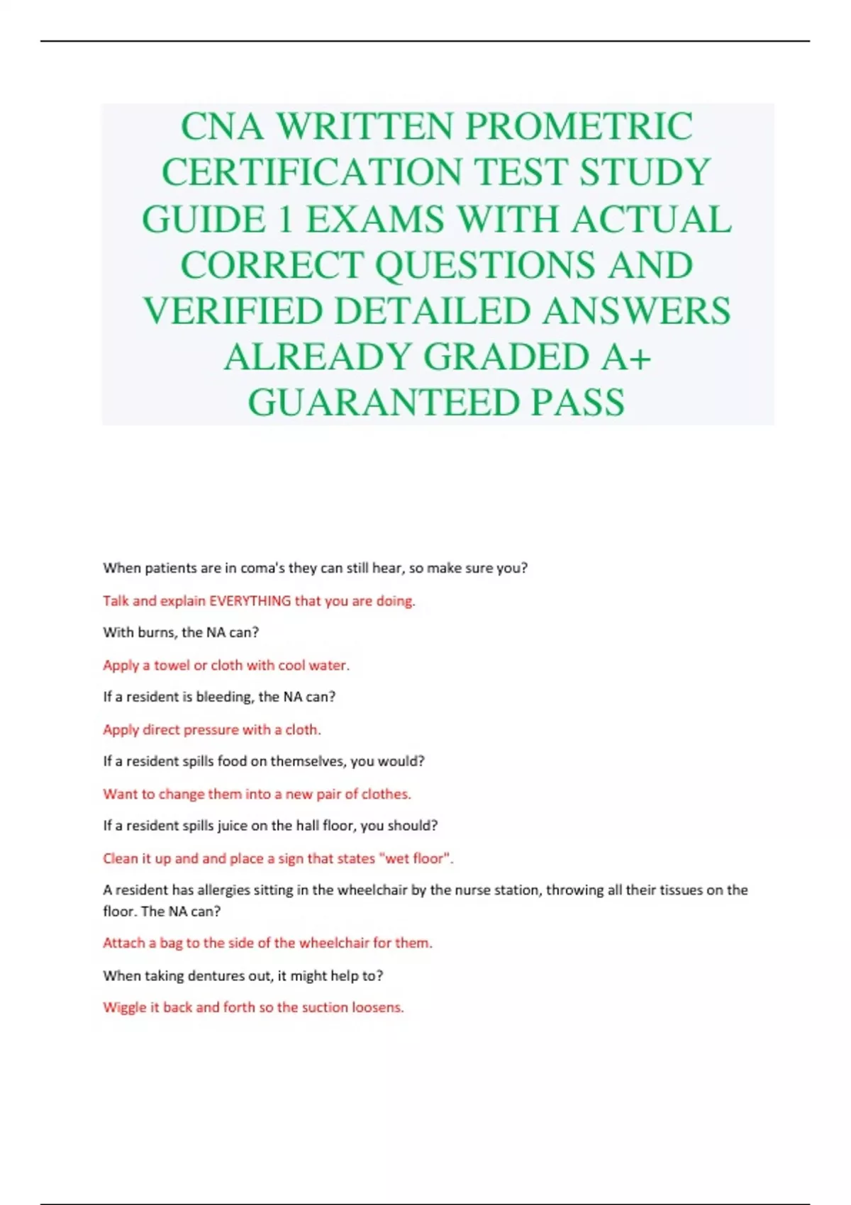 CNA WRITTEN PROMETRIC CERTIFICATION TEST STUDY GUIDE 1 EXAMS WITH ACTUAL CORRECT QUESTIONS AND VERIFIED DETAILED ANSWERS ALREADY GRADED A+ GUARANTEED PASS