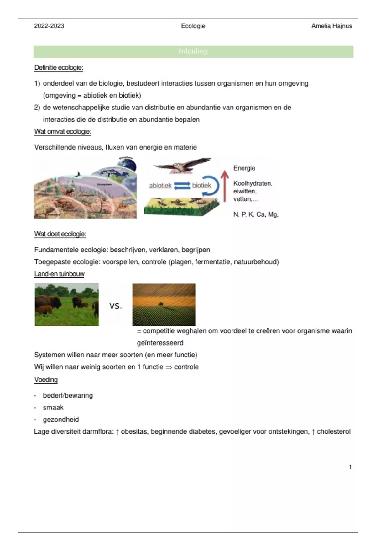 1) onderdeel van de biologie, bestudeert interacties tussen organismen en hun omgeving