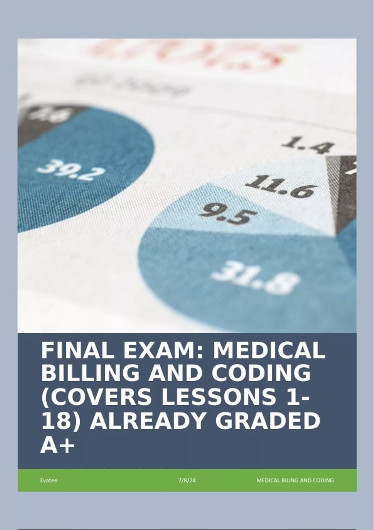 FINAL EXAM: MEDICAL BILLING AND CODING (COVERS LESSONS 1-18) ALREADY GRADED A+