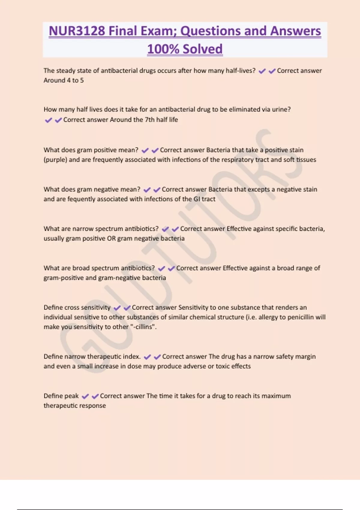 NUR3128 Final Exam; Questions and Answers 100% Solved The steady state of antibacterial drugs occurs after how many half-lives? Correct answer Around 4 to 5 How many half lives does it take for an antibacterial drug to be eliminated via urine? Correct answer Around the 7th half life What does gram positive mean? Correct answer Bacteria that take a positive stain (purple) and are frequently associated with infections of the respiratory tract and soft tissues