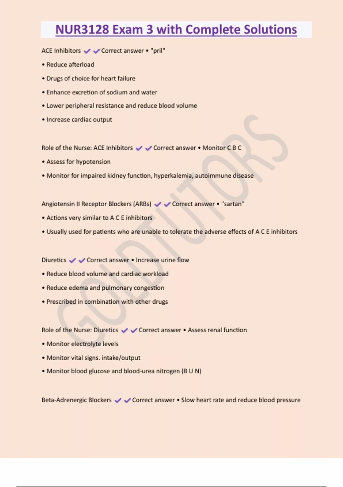 NUR3128 Exam 3 with Complete Solutions ACE Inhibitors Correct answer • "pril" • Reduce afterload • Drugs of choice for heart failure • Enhance excretion of sodium and water • Lower peripheral resistance and reduce blood volume • Increase cardiac output Role of the Nurse: ACE Inhibitors Correct answer • Monitor C B C • Assess for hypotension • Monitor for impaired kidney function, hyperkalemia, autoimmune disease