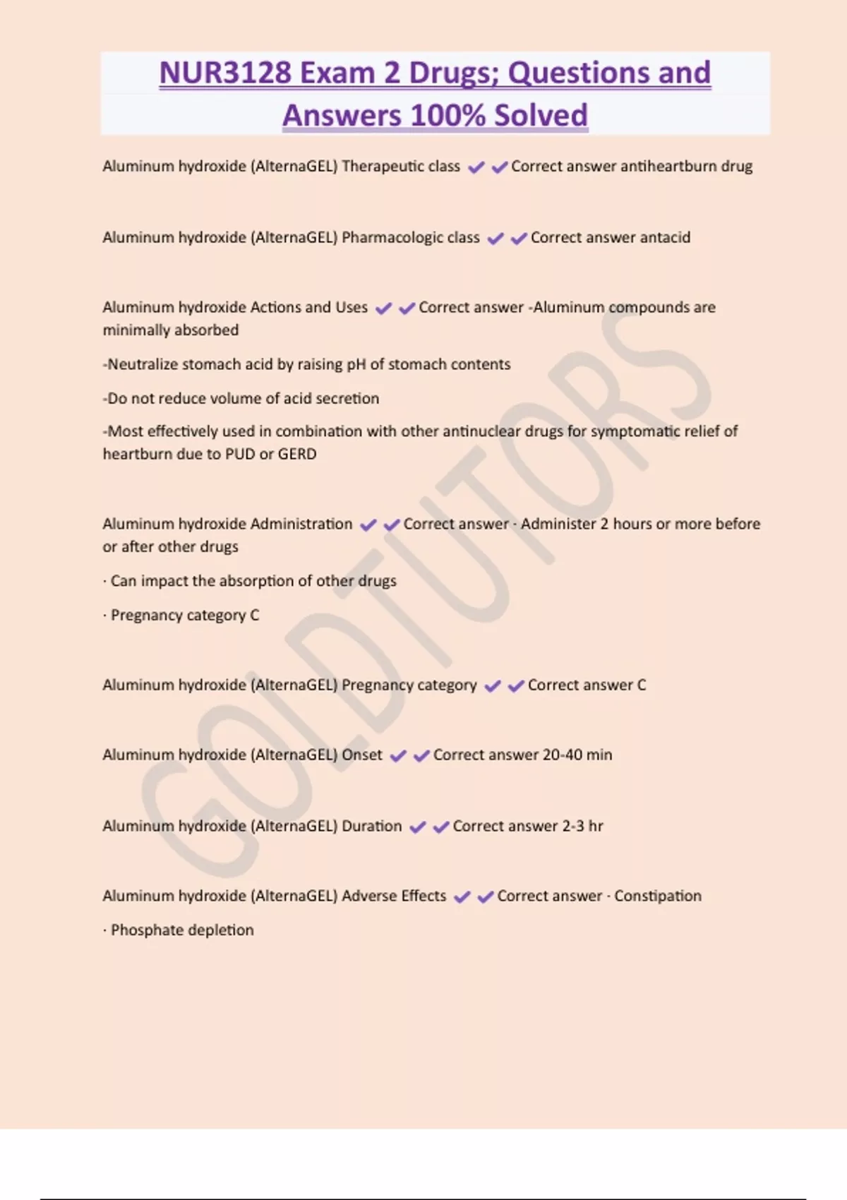 NUR3128 Exam 2 Drugs; Questions and Answers 100% Solved Aluminum hydroxide (AlternaGEL) Therapeutic class Correct answer antiheartburn drug Aluminum hydroxide (AlternaGEL) Pharmacologic class Correct answer antacid Aluminum hydroxide Actions and Uses Correct answer -Aluminum compounds are minimally absorbed -Neutralize stomach acid by raising pH of stomach contents -Do not reduce volume of acid secretion -Most effectively used in combination with other antinuclear drugs for symptomatic relief of heartburn due to PUD or GERD