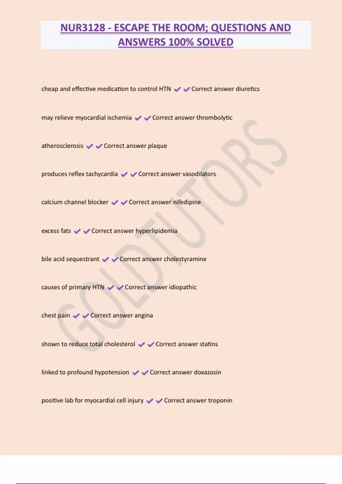 NUR3128 - ESCAPE THE ROOM; QUESTIONS AND ANSWERS 100% SOLVED cheap and effective medication to control HTN Correct answer diuretics may relieve myocardial ischemia Correct answer thrombolytic atherosclerosis Correct answer plaque produces reflex tachycardia Correct answer vasodilators calcium channel blocker Correct answer nifedipine excess fats Correct answer hyperlipidemi