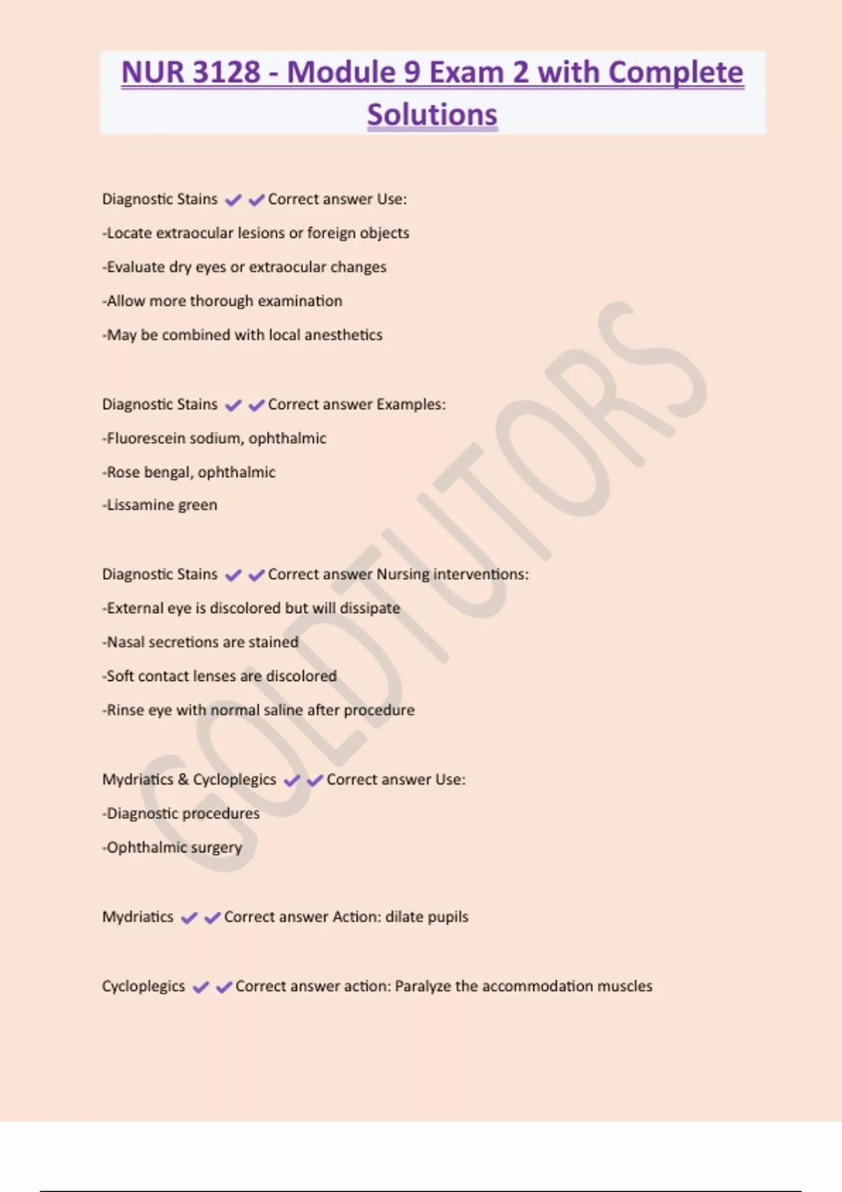 NUR 3128 - Module 9 Exam 2 with Complete Solutions Diagnostic Stains Correct answer Use: -Locate extraocular lesions or foreign objects -Evaluate dry eyes or extraocular changes -Allow more thorough examination -May be combined with local anesthetics Diagnostic Stains Correct answer Examples: -Fluorescein sodium, ophthalmic -Rose bengal, ophthalmic -Lissamine green