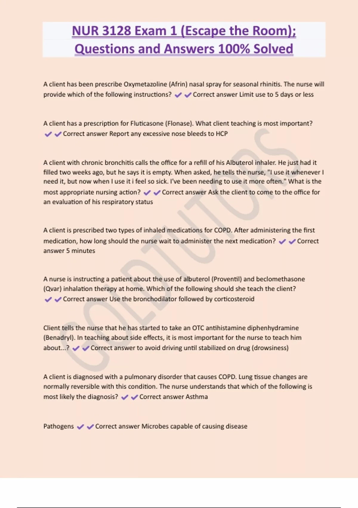 NUR 3128 Exam 1 (Escape the Room); Questions and Answers 100% Solved A client has been prescribe Oxymetazoline (Afrin) nasal spray for seasonal rhinitis. The nurse will provide which of the following instructions? Correct answer Limit use to 5 days or less A client has a prescription for Fluticasone (Flonase). What client teaching is most important? Correct answer Report any excessive nose bleeds to HCP A client with chronic bronchitis calls the office for a refill of his Albuterol inhaler. He just had it filled two weeks ago, but he says it is empty. When asked, he tells the nurse, "I use it whenever I need it, but now when I use it i feel so sick. I've been needing to use it more often." What is the most appropriate nursing action? Correct answer Ask the client to come to the office for an evaluation of his respiratory status