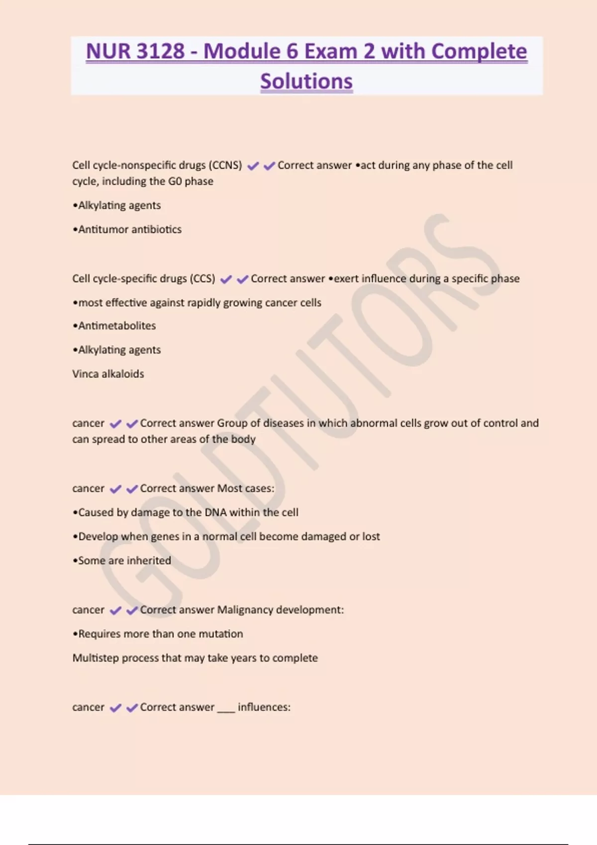 NUR 3128 - Module 6 Exam 2 with Complete Solutions Cell cycle-nonspecific drugs (CCNS) Correct answer •act during any phase of the cell cycle, including the G0 phase •Alkylating agents •Antitumor antibiotics Cell cycle-specific drugs (CCS) Correct answer •exert influence during a specific phase •most effective against rapidly growing cancer cells •Antimetabolites •Alkylating agents Vinca alkaloids