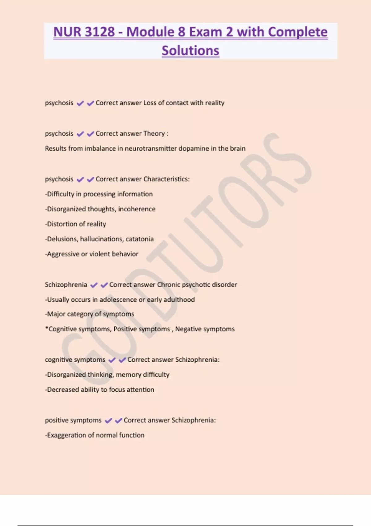 NUR 3128 - Module 8 Exam 2 with Complete Solutions psychosis Correct answer Loss of contact with reality psychosis Correct answer Theory : Results from imbalance in neurotransmitter dopamine in the brain psychosis Correct answer Characteristics: -Difficulty in processing information -Disorganized thoughts, incoherence -Distortion of reality -Delusions, hallucinations, catatonia -Aggressive or violent behavio