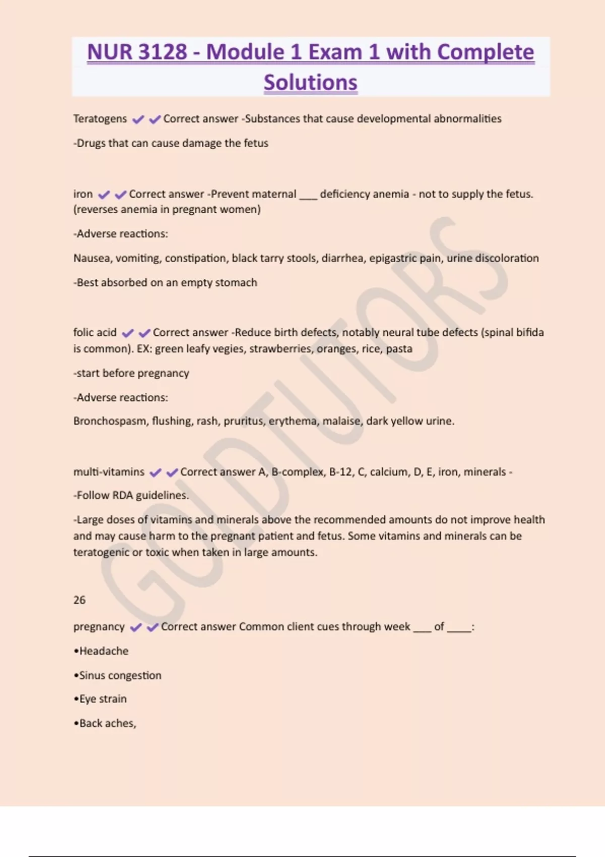 NUR 3128 - Module 1 Exam 1 with Complete Solutions Teratogens Correct answer -Substances that cause developmental abnormalities -Drugs that can cause damage the fetus iron Correct answer -Prevent maternal ___ deficiency anemia - not to supply the fetus. (reverses anemia in pregnant women) -Adverse reactions: Nausea, vomiting, constipation, black tarry stools, diarrhea, epigastric pain, urine discoloration -Best absorbed on an empty stomach folic acid Correct answer -Reduce birth defects, notably neural tube defects (spinal bifida is common). EX: green leafy vegies, strawberries, oranges, rice, pasta -start before pregnancy -Adverse reactions: Bronchospasm, flushing, rash, pruritus, erythema, malaise, dark yellow urine